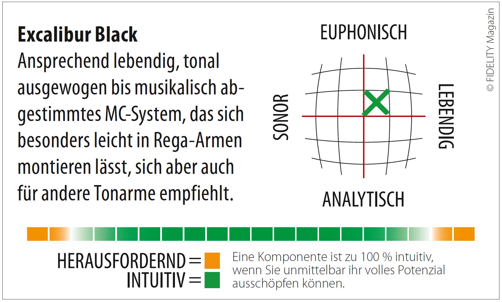 Dem Bass schließt sich ein offener Mitteltonbereich an, der ansatzlos von niemals nervenden und trotzdem detailreichen Höhen gekrönt wird. Eine solche musikalische Geschlossenheit findet man bei MC-Tonabnehmern nicht so häufig. Insbesondere, wenn neben musikalischer Homogenität auch noch Spielfreude gefragt ist. Genau das aber zeichnet das Excalibur Black aus, und deshalb hat es sich eine dicke Empfehlung redlich verdient – keineswegs nur für Besitzer von Rega-Tonarmen.