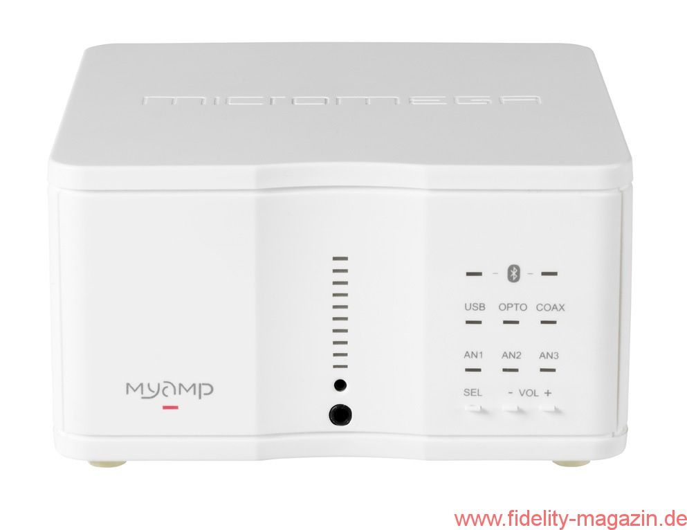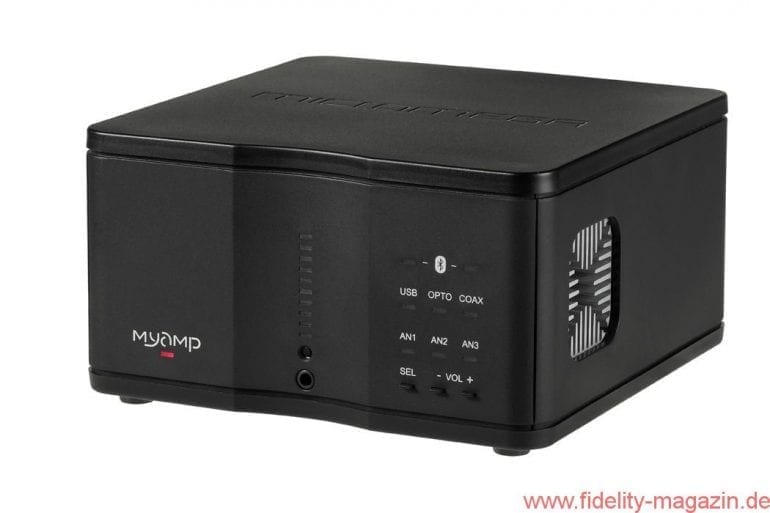 Den Kleinen zum Zentrum der Büroschreibtisch-Beschallung zu machen, wie es ein mit mir befreundeter HiFi-Journalist zu machen pflegt, ist allerdings fast schon respektlos – denn dieser Mini gefällt mit Maxiklang. Und er hat sogar ganz nebenbei noch einen hochwertigen DAC an Bord, der digitale Quellen älteren Datums klanglich spürbar aufwertet. Es ist kein Fehler, den MyAMP mit richtig guten Lautsprechern zu kombinieren. Freilich liegt es nahe, mit handlichen Kompaktböxchen eine Mikroanlage aufzubauen, die notfalls im Koffer mitgenommen wird und dann sogar im Hotelzimmer für erhebende Klangerlebnisse sorgt. Zumal der MyAMP konsequenterweise das Netzteil bereits eingebaut hat und man deshalb nicht mit zwei separaten Plastikschachteln durch die Lande reisen muss. Als Quelle kann auch das Smartphone dienen, denn Bluetooth ist ebenfalls serienmäßig an Bord.
