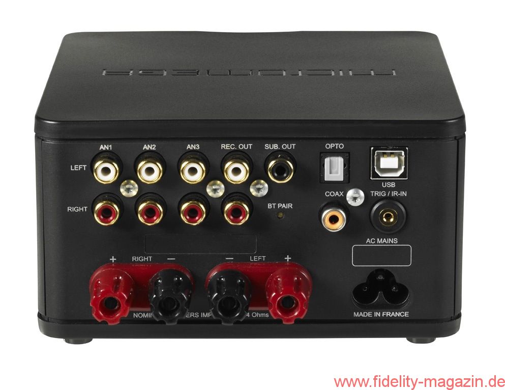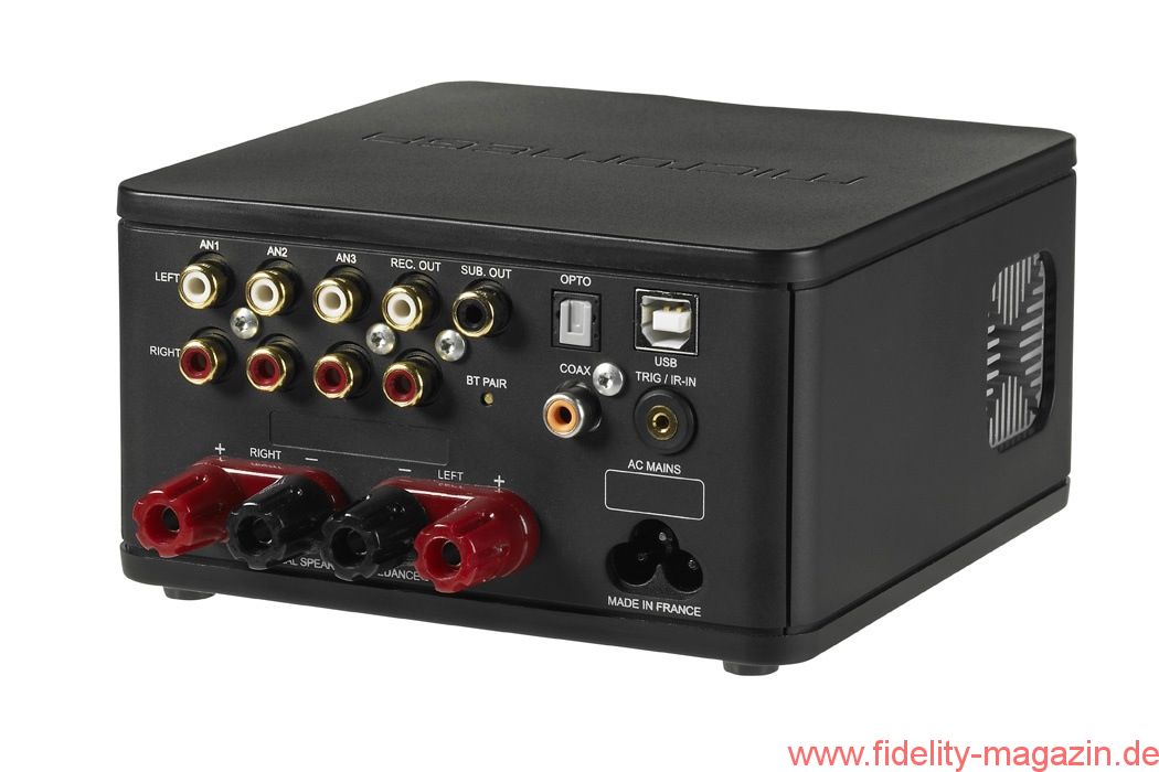 Im Design dazu passend gibt es sogar einen Phono-Vorverstärker namens MyGROOV (Franzosen konnten noch nie vernünftig Englisch), weshalb mich auch nichts davon abhalten kann, den Spaßwürfel bei nächster Gelegenheit zum Aufbau einer puristischen Mikro-(Mega)-Kette aus Plattenspieler, Verstärker und Lautsprechern zu nutzen, bei der dann das große Masselaufwerk eindeutig den meisten Raum einnimmt. Apropos puristisch: Auf dem gedrängten Anschlussfeld des MyAMP finden wahrhaftig noch analoge „Rec-Out“- und „Sub-Out“-Buchsen Platz, weshalb das Verstärkerchen auch noch für ganz andere Konstellationen einsetzbar ist, etwa als Zuspieler für den Kopfhörerverstärker MyZIC oder einen aktiven Subwoofer.