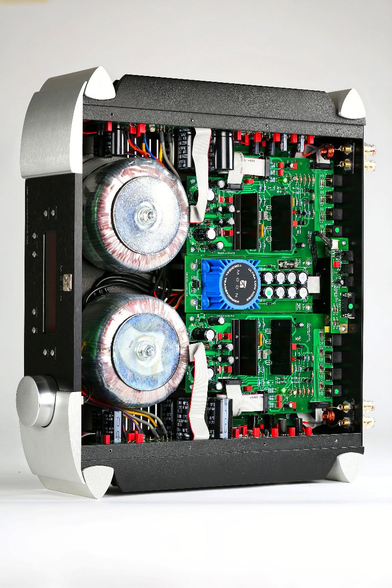 Das haben Sie so oder so ähnlich möglicherweise schon mal bei Mark-Levinson-Gerätschaften gesehen? Ja, gewisse Ähn­lichkeiten gehen auch über die markante Bicolor-Ausführung des Testgerätes hinaus. Wer nun Eigenständigkeit demonstrie­ren oder den Moon in ein bestehendes Audiosystem integrieren möchte, das nur Schwarz oder Silber (ver)trägt, der ordert den Amp mit entsprechend einfarbiger Front. Am technischen Inhalt des 700i ändert das natürlich überhaupt nichts.