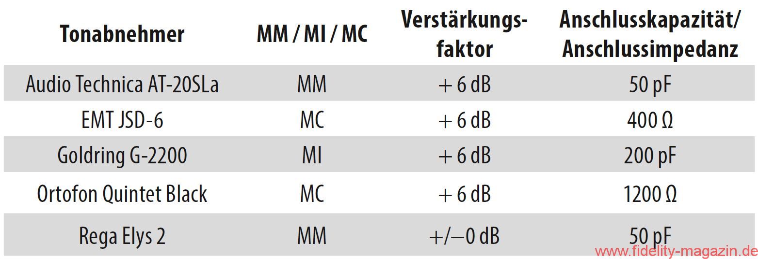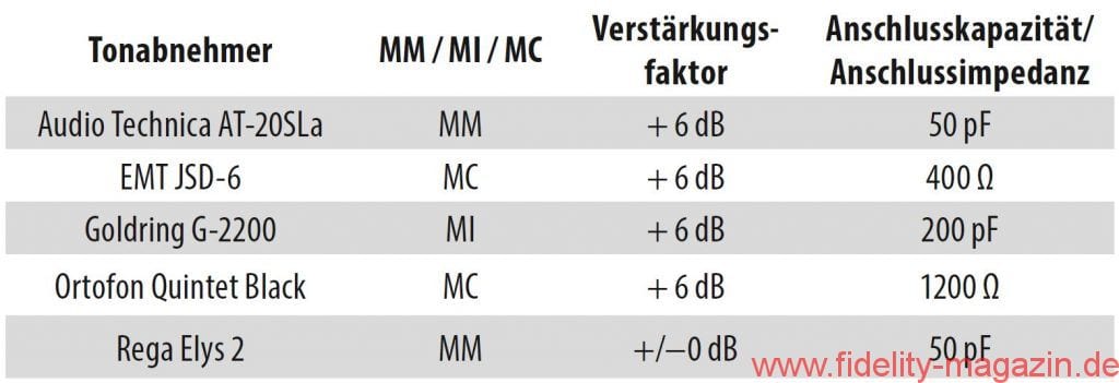 Besonderheiten: Subsonicfilter (IEC, schaltbar), variable Verstärkungsfaktoren, Eingangswiderstände (MC) und Eingangskapazitäten (MM)