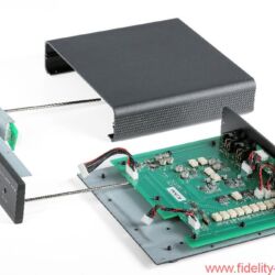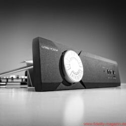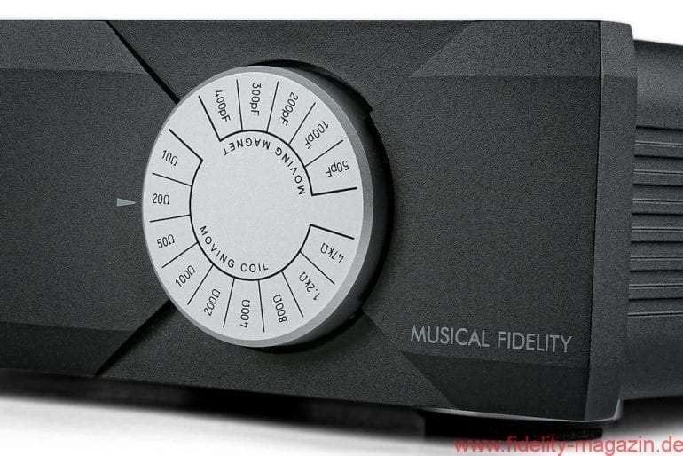 Die Vorderseite des MX-VYNL, die in Schwarz oder Silber verfügbar ist, wirkt ebenfalls sehr aufgeräumt und wird durch einen runden, stets silberfarbenen Drehschalter dominiert. Dieser ermöglicht einerseits die Wahl zwischen Moving-Magnet- und Moving-Coil-Systemen, andererseits die Feinanpassung durch die Einstellung der Eingangskapazität für MM-Systeme und Eingangsimpedanz für MC-Systeme. Die zur Auswahl stehenden Werte sind ausgesprochen praxisgerecht ausgewählt: Mit fünf verschiedenen Eingangsimpedanzen sollte jedes MM und mit sieben Impedanzwerten jedes MC adäquat abgeschlossen werden können.