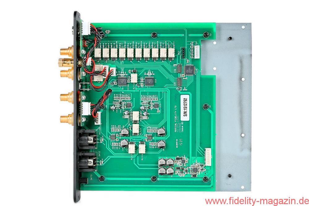 Über den Grundverstärkungsfaktor des MX-VYNL schweigt sich Musical-Fidelity-Chef Anthony Michaelson allerdings genauso aus wie über technische Details seiner Verstärkerschaltung. Ein kleiner silberner Schalter hebt bei Bedarf den Verstärkungsfaktor des kleinen Phonoentzerrers um sechs Dezibel an. Ein weiterer, mit „EQ“ bezeichneter Schalter ermöglicht den Betrieb mit (IEC) und ohne Subsonicfilter (RIAA). Ganz rechts folgt noch der Power-Schalter, der in Wirklichkeit den MX-VYNL nur aus dem Standby-Schlaf holt. Dass er währenddessen nur etwa 0,25 Watt verbraucht, beruhigt auch das Umweltgewissen.