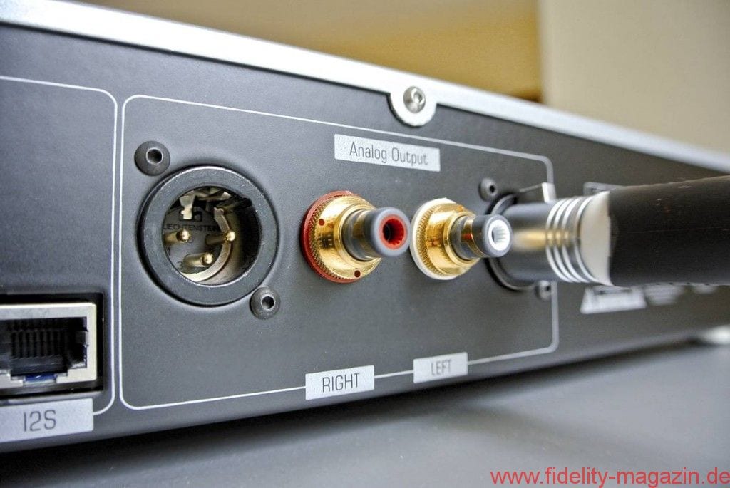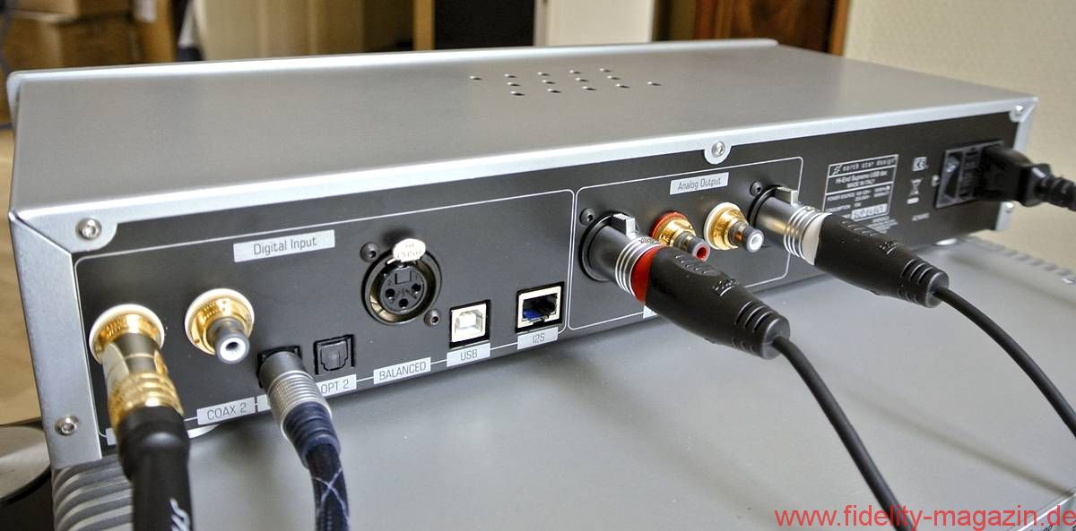 Doch beginnen wir mit einem Rundgang ums Gerät: Auf der Frontseite finden wir einen Standby-Taster und zwei Taster, mit denen die sieben Digitaleingänge durchgeschaltet werden können. Die bereits genannten 7-Segment-Anzeigen geben Auskunft über den angewählten Eingang und die anliegende Samplingrate. Auf der Rückseite ist schon etwas mehr los: Neben einem harten Ein/Aus-Schalter gibt es insgesamt sieben Digitaleingänge: 2 x S/PDIF koaxial, 2 x S/PDIF TosLink, einen symmetrischen AES/EBU-Eingang (XLR), einen USB-Eingang und eine I2S-Schnittstelle, beispielsweise zum Anschluss eines North-Star-CD-Laufwerks. Ausgangsseitig gibt es erwartungsgemäß je einen symmetrischen XLR-Ausgang und ein Paar Cinchbuchsen.