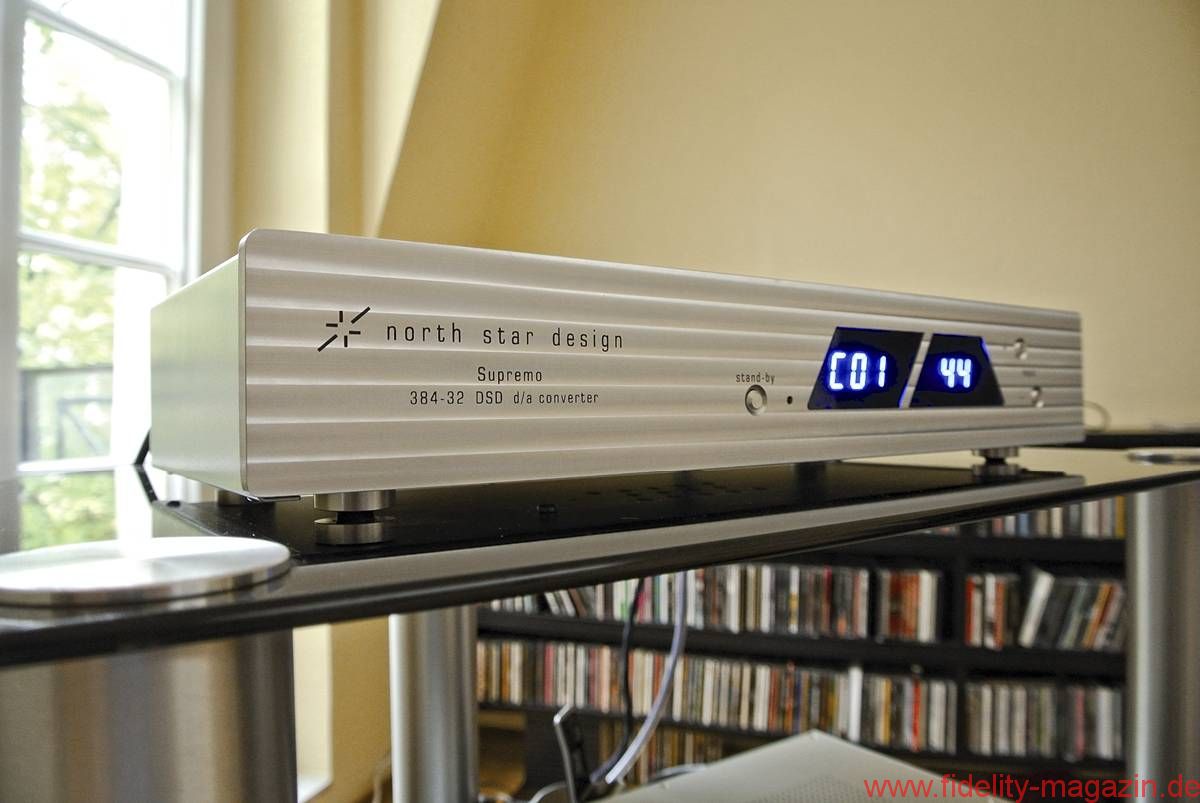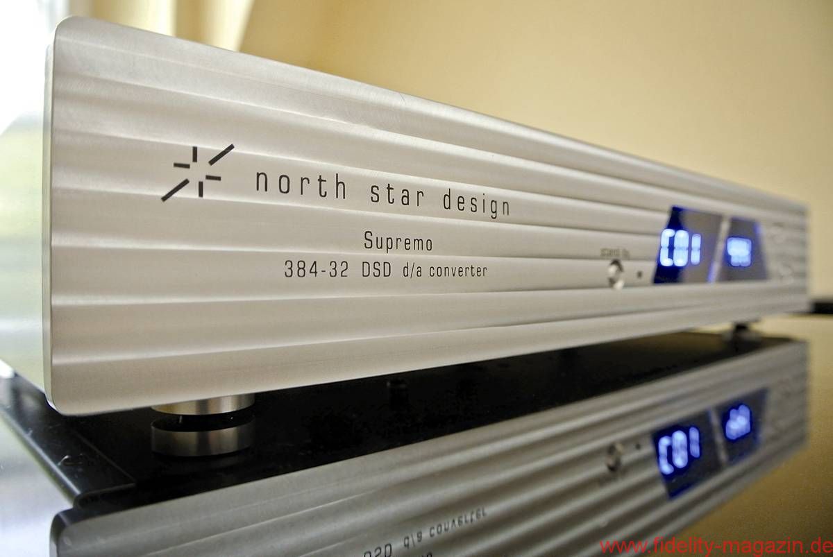 Er stammt aus Vecchiano, nur wenige Kilometer von Pisa entfernt: Der Supremo, das Topmodell aus einer neuen Serie von DSD-fähigen Wandlern des italienischen Herstellers North Star. Eines kann man dem Supremo sicherlich nicht bescheinigen: Beliebigkeit. Und das fängt schon beim Äußeren an. Da wäre die fast einen Zentimeter starke Alu-Frontplatte mit einer raffiniert eingefrästen Wellenoptik. Da wären die beiden asymmetrischen, kräftig blau leuchtenden 7-Segment-Anzeigen – die linke in Form eines Parallelogramms und die rechte in Trapezform. Da wären aber auch innere Werte, wie zum Beispiel die Fähigkeit, per USB Daten im DSD 2.8- und PCM 384-kHz-Standard zu wandeln. Und nicht zuletzt wäre da auch die Möglichkeit, an verschiedenen Filterparametern herumzuschrauben. Nein, der North Star Supremo ist gewiss kein Feld-Wald-und-Wiesen-DAC.