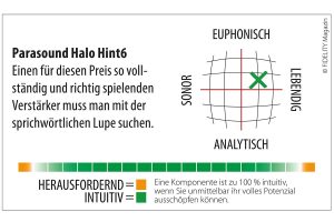 Weniger Tage später kommt das Paket bei mir an, ich packe es erwartungsvoll aus und sehe, dass sich äußerlich nicht so viel geändert hat. Das war ja schon früher so, der Klang aber konnte damals begeistern. Na gut, mittlerweile habe ich viel gehört, besitze Lautsprecher, die deutlich präziser arbeiten als eine alte Kappa 9a, und gehe daher mit eher nostalgischen Gefühlen an diesen Bericht und das erste Hören. Viele Helden von früher enttäuschen heute, und diesen Effekt befürchte ich auch hier. Also ersetzt der Parasound Halo Hint6 für einen ersten Eindruck meine Verstärker im Studio, spielt über Vovox-Kabel zwischen dem Merging-Wandler und Sky-Audio-Lautsprechern. Die erste Musik startet und … Mist. Schnell ist klar, dass ich jetzt ein Problem habe, denn dieser Parasound, frisch und kalt aus dem Karton, verweist meine Verstärker aus dem Stand auf die hinteren Plätze. Und zwar so gründlich, dass es nicht nötig ist, noch etwaigen klangfarblichen Details nachzuspüren. In diesem Fall haben zwei Sekunden vollauf genügt.