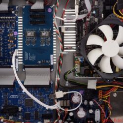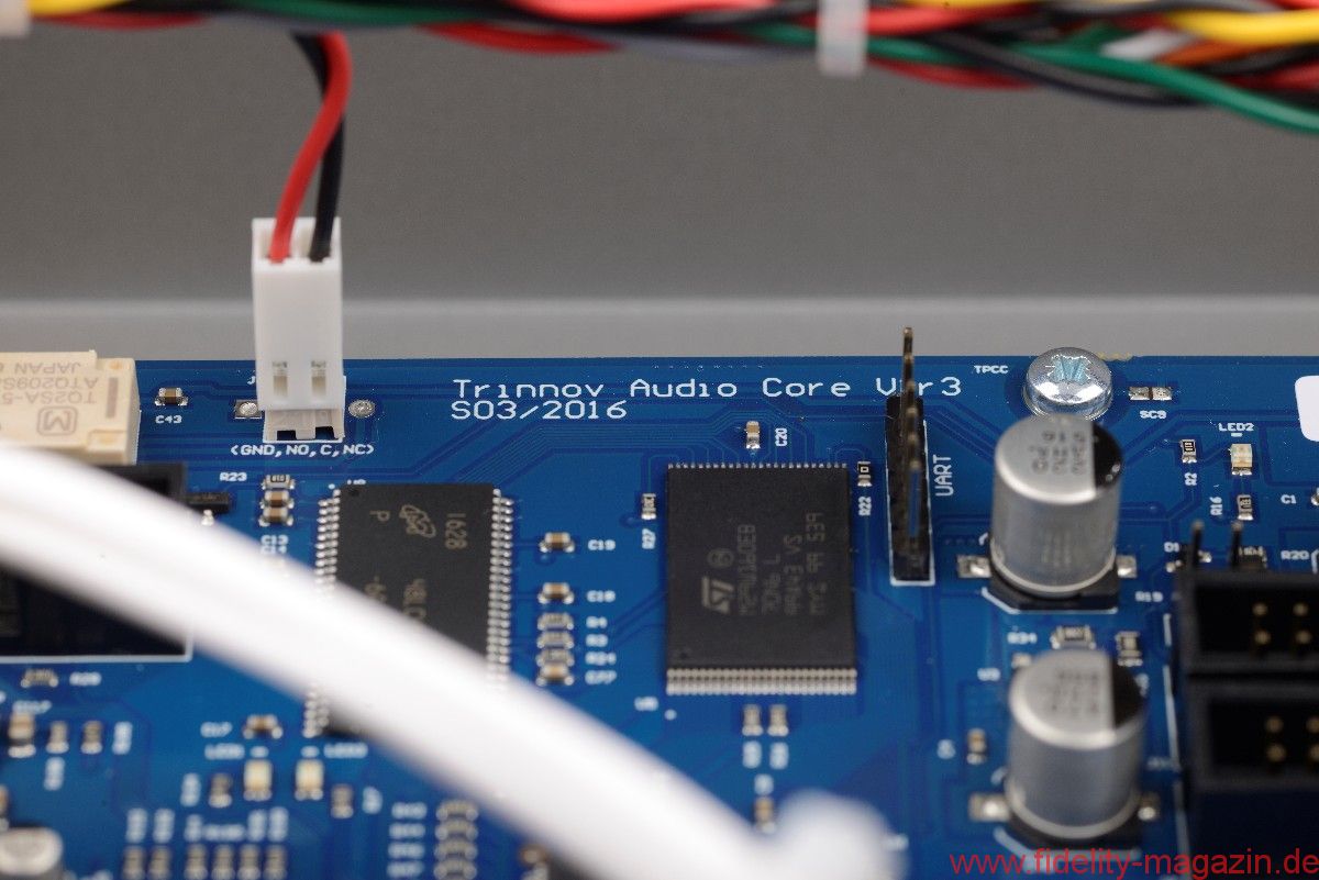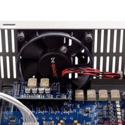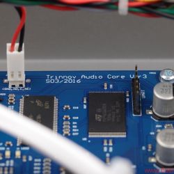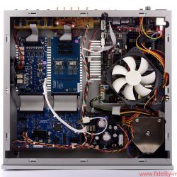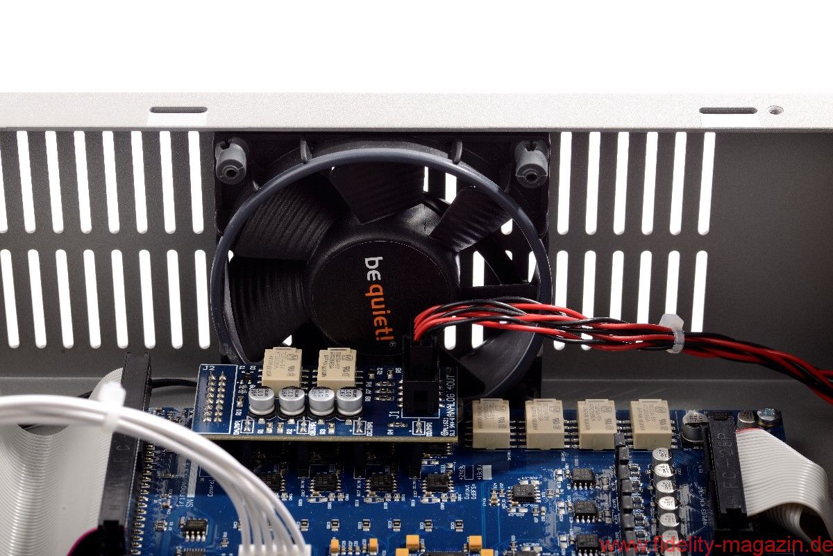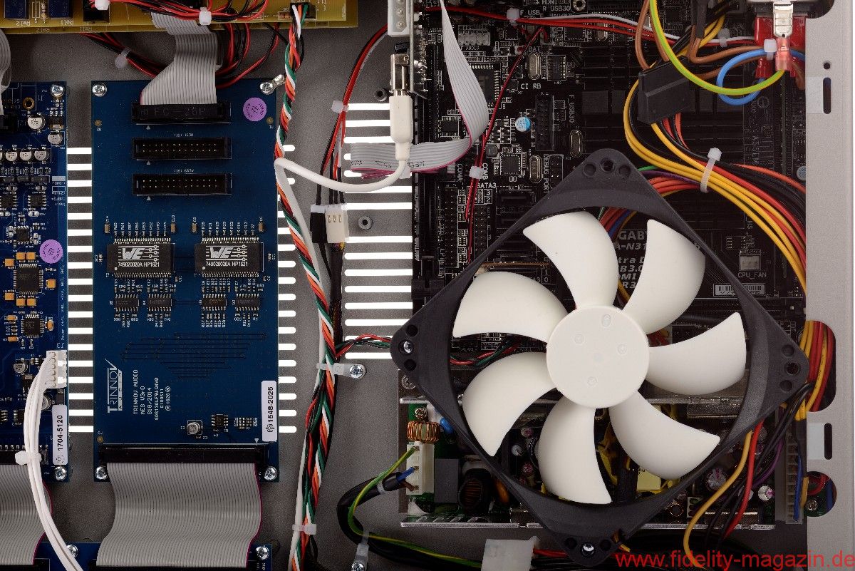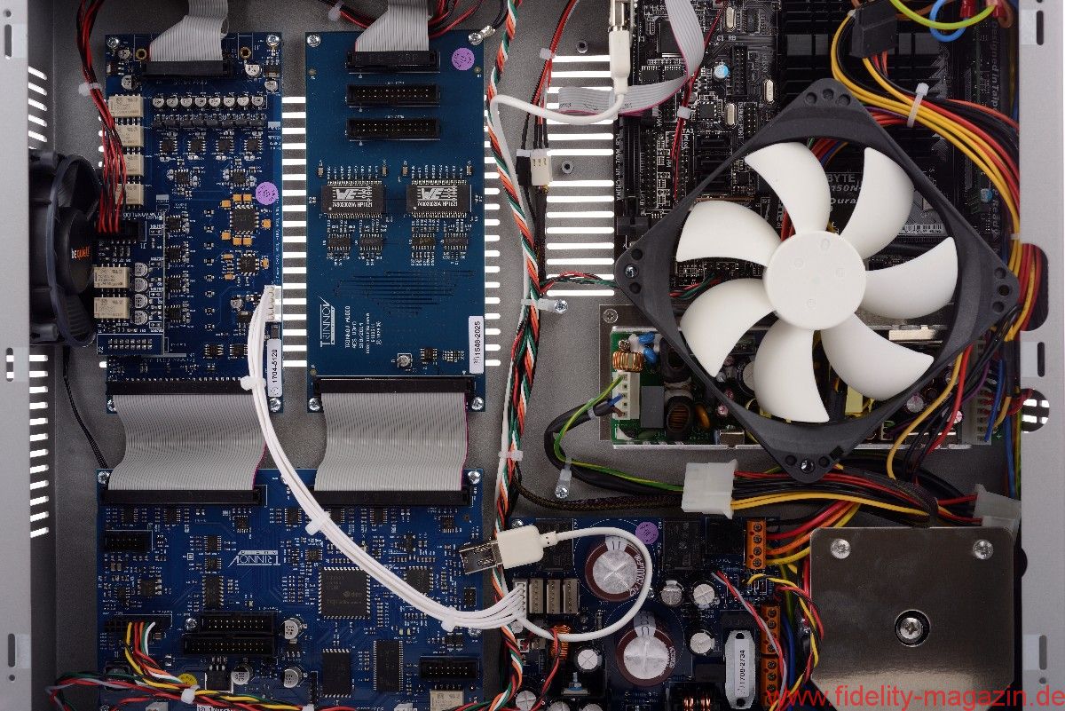 Die sorgfältig von der Rechner-Sektion getrennten Audio-Boards sind Trinnov-Eigenentwicklungen, weil sie nur so die dem hohen Anspruch gerecht werden können. Die Audio-Abteilung verfügt über ein eigenes Netzteil mit eindrucksvollem Ringkerntrafo, die DA-Wandlung obliegt dem vierkanaligen Burr-Brown-Chip PCM4204. Ein besonderes Leckerli stellt der DICE Junior-Chip dar, der die interne, rein digitale Signalverarbeitung steuert. Das unscheinbare Bauteilchen verarbeitet maximal 64 Audiokanäle und – ganz wichtig für eine optimale, zeitrichtige Wiedergabe – fungiert als vorzüglicher Jitter-Unterdrücker. Die Rechner-Sektion und das kleine Analog-Board haben eigene Lüfter, die recht leise – wohlgemerkt nicht völlig lautlos – arbeiten und das komplizierte System vor einem Hitzschlag schützen.