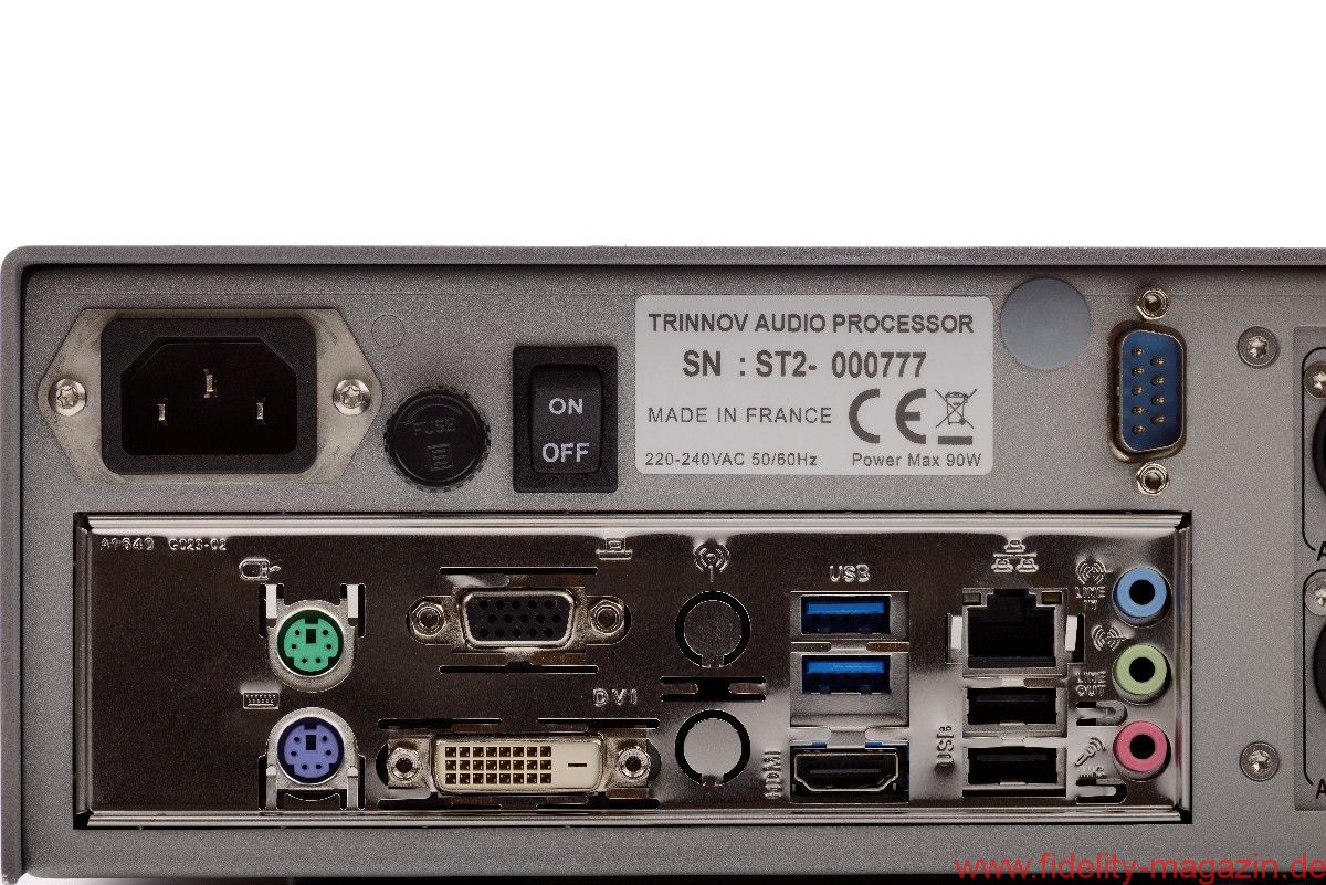 Der ST2-HiFi besitzt als einziges Bedienelement einen illuminierten Ein-/Ausschalter auf der dickwandigen Aluminium-Front. Der genügt auch, sobald das Gerät optimal eingerichtet und in die heimische Anlage integriert ist. Dafür müssen zunächst die analogen und digitalen Komponenten wie (Phono-)Preamps, CD-Player oder Wandler sowie selbstverständlich die Lautsprecher mit dem Trinnov verbunden sein. Dank zahlreicher Anschlüsse kein Problem.