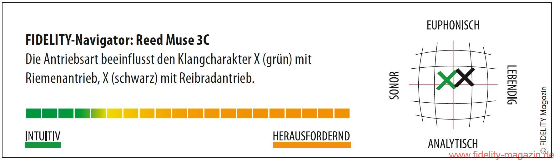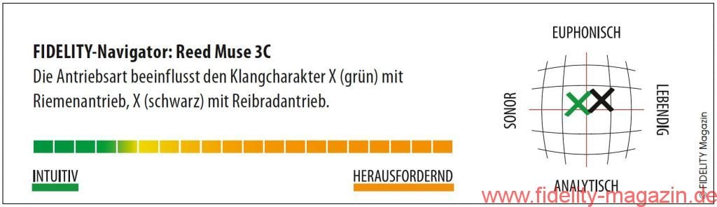 Während der Wochen des Hörtests kristallisierte sich die nahezu perfekte Ausbalanciertheit des Muse in Verbindung mit den beiden Tonarmen als charakterisierende Eigenschaft heraus. Meine Empfehlung lautet daher eindeutig: Die Arme und das Laufwerk von Reed gehören zusammen. Üblicherweise fühlen sich Laufwerkshersteller irgendwann in der Pflicht, auch einen eigenen Tonarm anzubieten, aber hier verhält es sich umgekehrt. Der Muse wurde für die Tonarme geschaffen. Am vortrefflichsten hört man das bei flächigen Sounds wie beispielsweise Becks „The Golden Age“, wenn das Laufwerk für fesselnde Präsenz sorgt und das Holz der Arme ganz leicht, angenehm und warm koloriert. Nicht, dass es jeweils für sich betrachtet eine Tendenz ins Extreme gäbe, aber in Verbindung gehen Dreher und Arme Hand in Hand, ergänzen sich zum Dreamteam. Das funktioniert nur so gut, weil sie keine Schwächen des Partners ausgleichen müssen, sondern in der Summe ihrer Eigenschaften über sich hinauswachsen. Dieser Eindruck bleibt übrigens auch beim Riemenantrieb bestehen, der lediglich eine größere Abbildung, etwas längeres Ausklingen und ein sanftes Verwischen des Fokus im Grenzbereich nach sich zieht. Mich spricht der pointiertere Reibradbetrieb mehr an, aber „gezogen“ klingt der Muse nach großem Masselaufwerk mit majestätischem, getragenem Spielfluss.