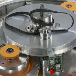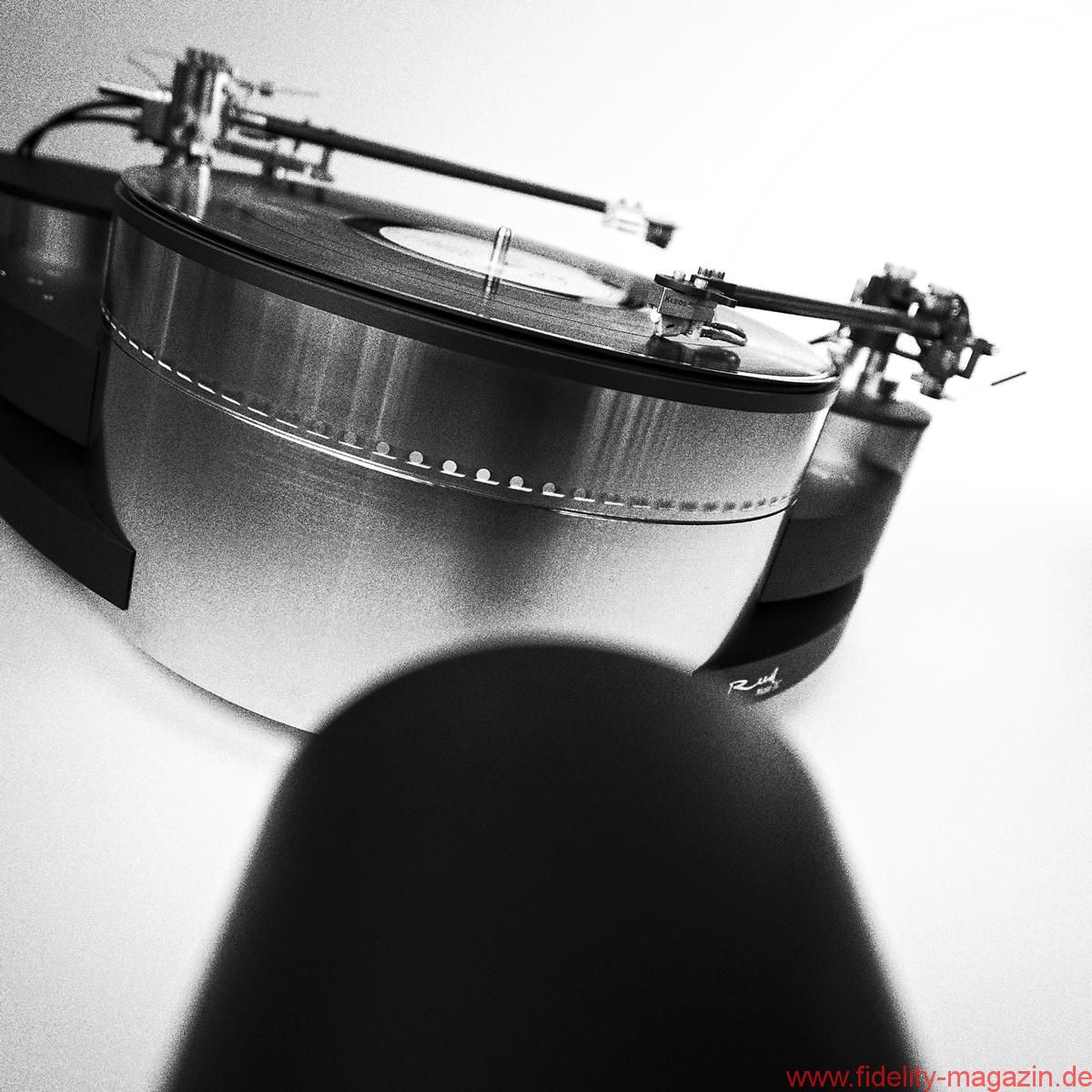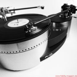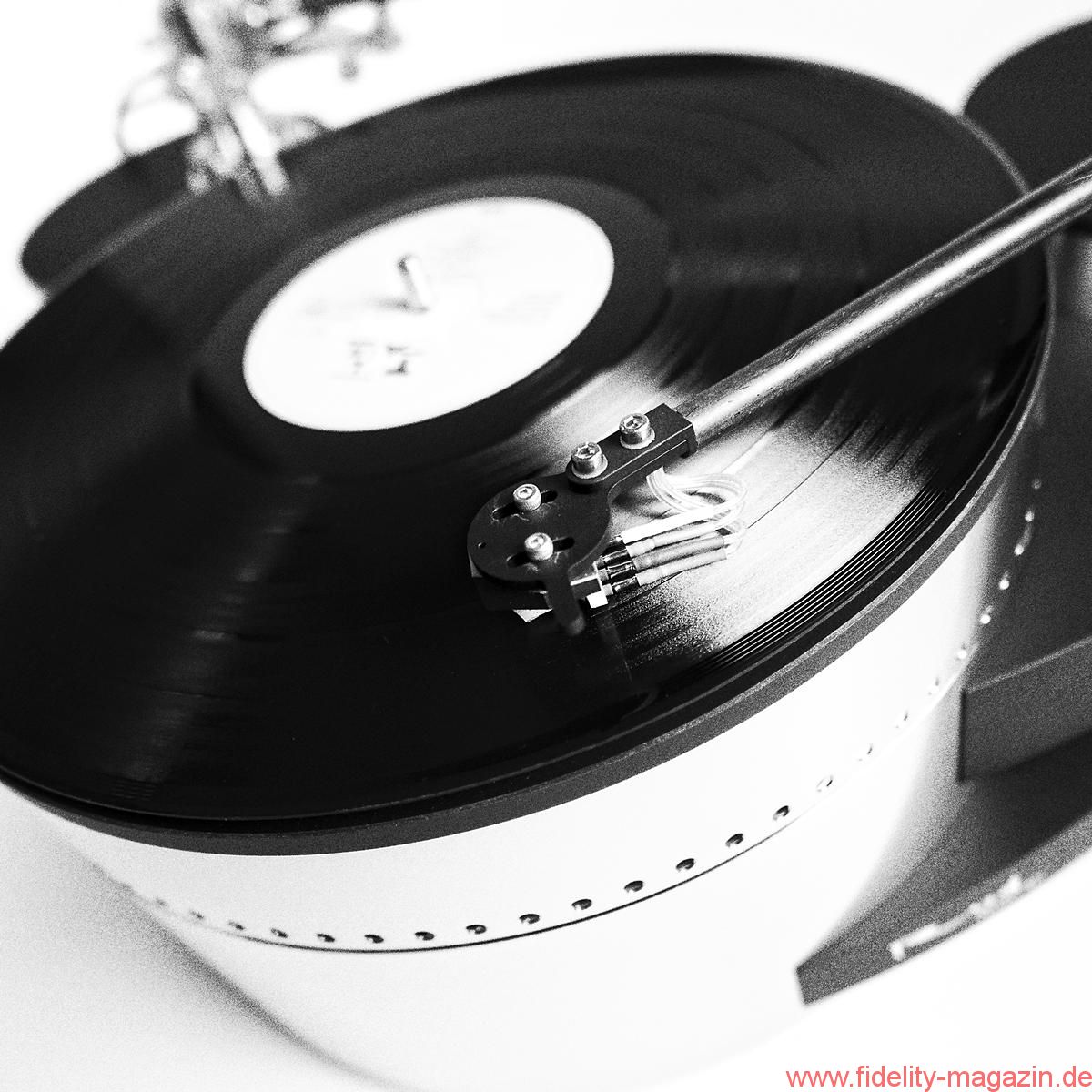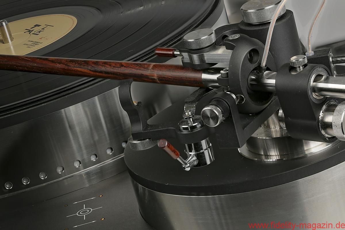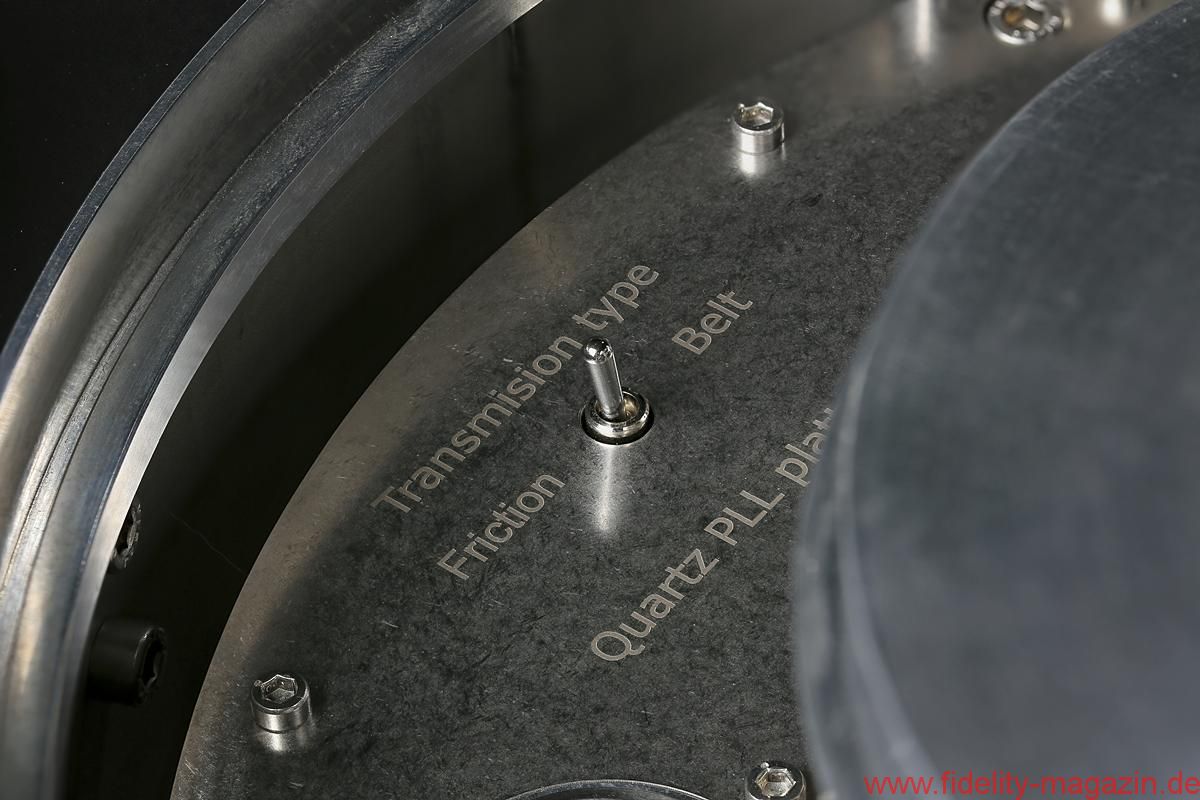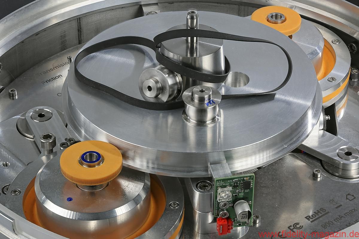 Im Stillstand hebt ein Elektromagnet die beiden Reibräder vom Subteller ab, um genau oben erwähnte Standschäden zu verhindern. Kein notwendiges Feature im Alltag, doch die Erben werden sich in 40 Jahren freuen, wenn sie einen verstaubten vermeintlichen Dampfkochtopf vom Speicher holen. Das Anlaufen geschieht mit kurzzeitig vermindertem Drehmoment, was die weichen Gummiräder vor zu schneller Abrasion bewahrt. Zwei sich gegenüberstehende Reibräder sind schon eine gute Idee, um horizontale Kräfte aufs Lager zu egalisieren, aber es wird noch besser: Sie besitzen außerdem minimal unterschiedliche Durchmesser. Das sorgt dafür, dass sich das unvermeidliche Polruckeln der beiden Gleichstrommotoren unregelmäßig verteilt, statt sich aufzuaddieren. Sehr durchdacht! Aber auch komplex bezüglich der von einem Schwingquarz geregelten Motorelektronik, die ja überdies bei Bedarf auch noch den Wechsel des Antriebsprinzips meistern muss. Beachtlich! Um auf Riemenantrieb umzurüsten, müssen lediglich die Reibräder durch Pulleys ersetzt sowie die beiden Ausleger, in denen die Motoren hängen, fixiert werden. Das ist so simpel und man macht dabei eine so ausgesprochen professionelle Figur, dass es sogar Spaß macht.