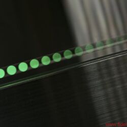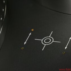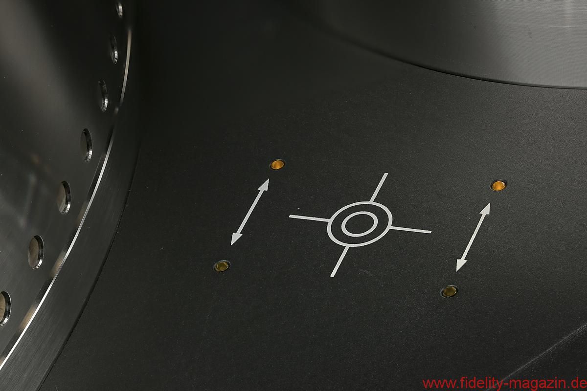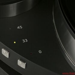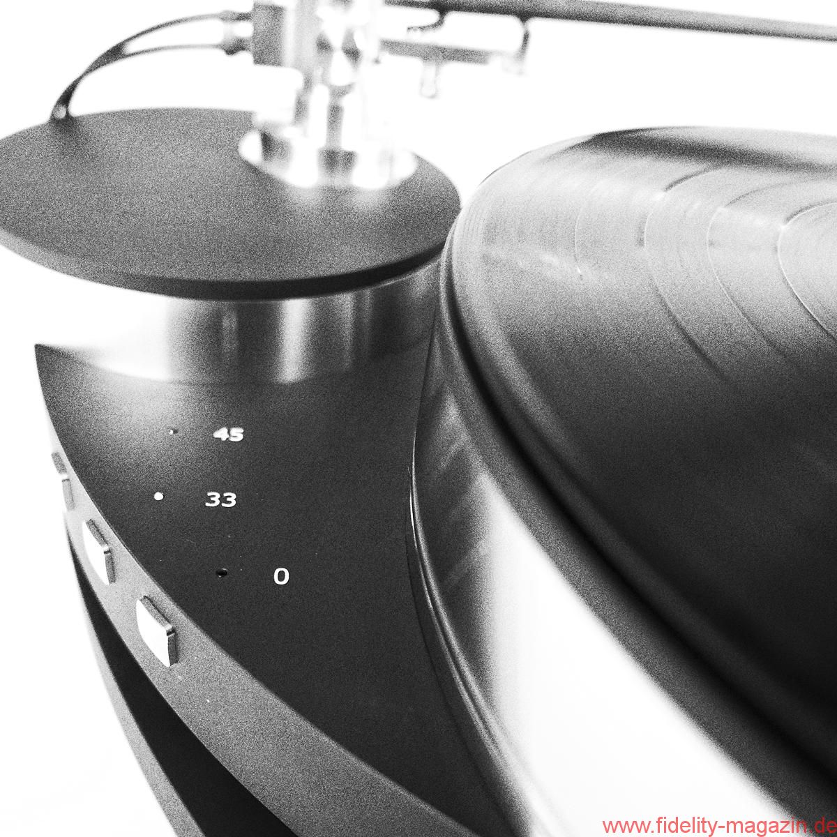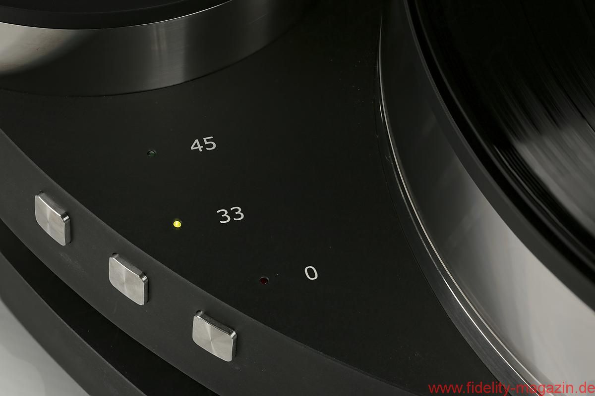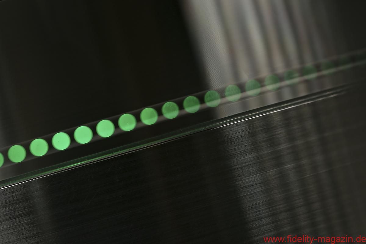 Umlaufend in den Teller integriert, gibt ein Lochband zunächst ein Rätsel auf, das sich erst löst, sobald man den Muse aktiviert. Die Tellerperforation bildet eine von hinten grün beleuchtete Stroboskopscheibe. Witzige Idee, allerdings unterliegen die beiden Gleichstrommotoren im Chassis einer quarzgeregelten PLL-Schleife, und somit gibt es auch keine Möglichkeit der manuellen Geschwindigkeitsjustage. Man kann also nur hoffen, dass die grünen Lichter still stehen. Beim Testmuster standen alle Punkte unverrückbar wie die grüne Welle einer langsam vorbeirauschenden Ampelkette, haben ihr gegenüber kurz- bis mittelfristig aber einen gewichtigen Vorteil: Man kann die Beleuchtung des Muse abstellen. Im rechten der beiden Armausleger, die aussehen wie Tragflächen eines Doppeldecker-Stealth-Jets, befindet sich ein sehr empfindliches elektronisches Inklinometer, das hilft, den Muse über drei Schraubfüße mit Feingewinde auszurichten: Sobald alle vier LEDs des Neigungsmessers erloschen sind, steht das Laufwerk in der Waage. Auf dem anderen Armausleger, die beide Tonarme bis zwölf Zoll in drehbaren, exzentrisch gebohrten Basen aufnehmen, befinden sich Taster für 33, 45 und 0 Umdrehungen.