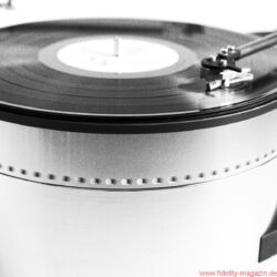Was an dessen preisgekröntem Design Assoziationen mit einem Dampfkochtopf weckt, ist das Material Edelstahl. Im Laufwerksbau ist Stahl eine sehr ungewöhnliche Wahl. Wenn man sich vorstellt, wie Indianer ihr Ohr aufs Gleis legten, um ein weit entferntes Stahlross zu hören, kann man nachvollziehen, warum. Dennoch erweckt der Muse den Eindruck, das beruhe auf einer sehr bewussten klanglichen Entscheidung, doch dazu in Kürze mehr. Ein Blick unter die dünne Tellermatte offenbart, dass der eigentliche Teller aus POM besteht und lediglich von einem Edelstahlband eingefasst wird. Die nicht besonders dicke oder schwere Acetal-Scheibe liegt auf einem massiven Subteller aus Edelstahl auf, den man genau genommen als Teil des Lagers betrachten muss, da er sich nicht einfach abheben lässt. Das Tellerlager ist eine beeindruckende Erscheinung, schade, dass es geschlossen ist und von Redakteuren nicht geöffnet werden darf. Es handelt sich um ein invertiertes Gleitlager inklusive Lagerkugel zwischen Spiegel und Edelstahldorn. Solche industriellen Metall-Polymer-Verbundgleitlager findet man selten in Plattenspielern, obwohl sie fast ideale Eigenschaften aufweisen. Sie sind für verhältnismäßig niedrige Gleitgeschwindigkeiten spezifiziert und lebenslang wartungsfrei. Üblicherweise wird dafür auf eine Sinterbronze-Gleitschicht eine Laufschicht aus PTFE aufgebracht. So ein Lager sollte nach einer gewissen Einlaufphase verschleißfrei seine Runden drehen. Dieses sehr stabil wirkende Konstrukt lässt den großen Aufwasch, der oft um Tellerlager veranstaltet wird, fast absurd erscheinen. Überspitzt formuliert: Das letzte Mal, als es die Menschheit vor ein Problem stellte, einen Bolzen langsam in einer Buchse rotieren zu lassen, ist jemandem die Klinge seines Faustkeils gebrochen. Neun von zehn Plattenspielern verfügen über ein simples Lager, dessen zwei Hälften der jeweilige Entwickler natürlich so bemessen hat, dass sie spielfrei ineinanderpassen. Ein gewisser Erfinderstolz ist dann schon angebracht, das will ich nicht bestreiten, aber es spricht auch nichts dagegen, sich auf bewährte Industriestandards zu verlassen.