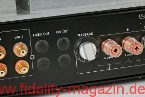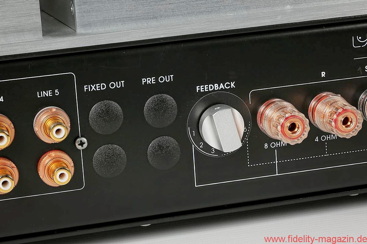 Um diesen sehr weit verbreiteten Anpassungsproblemen zu Leibe zu rücken, hat sich Lyric einen ebenso naheliegenden wie seltenen Kniff einfallen lassen: Eine jeweils in drei Stufen regelbare Feedback-Schleife für die Vier- und Acht-Ohm-Abgriffe ermöglicht dem Endkunden, seinen Ti 140 ganz einfach nach Gehör an die vorhandenen Lautsprecher anzupassen. Das geht sogar im laufenden Betrieb! Und man kann sofort hören, ob die Lautsprecher nach starker Kontrolle, also einem hohen Dämpfungsfaktor verlangen oder lieber freier schwingen, also mit weniger Kontrolle besser klingen. Wichtig fürs Verständnis ist dabei, dass es in diesem Zusammenhang nicht um die absolute Qualität von Verstärkern oder Schallwandlern geht, sondern ausschließlich um ihre Kompatibilität. Demzufolge hat der Lyric Ti 140 mit seiner variablen Gegenkopplung einen unschätzbaren Vorteil: Er verträgt sich mit einer größeren Zahl an Lautsprechern als vergleichbare Röhrenverstärker.