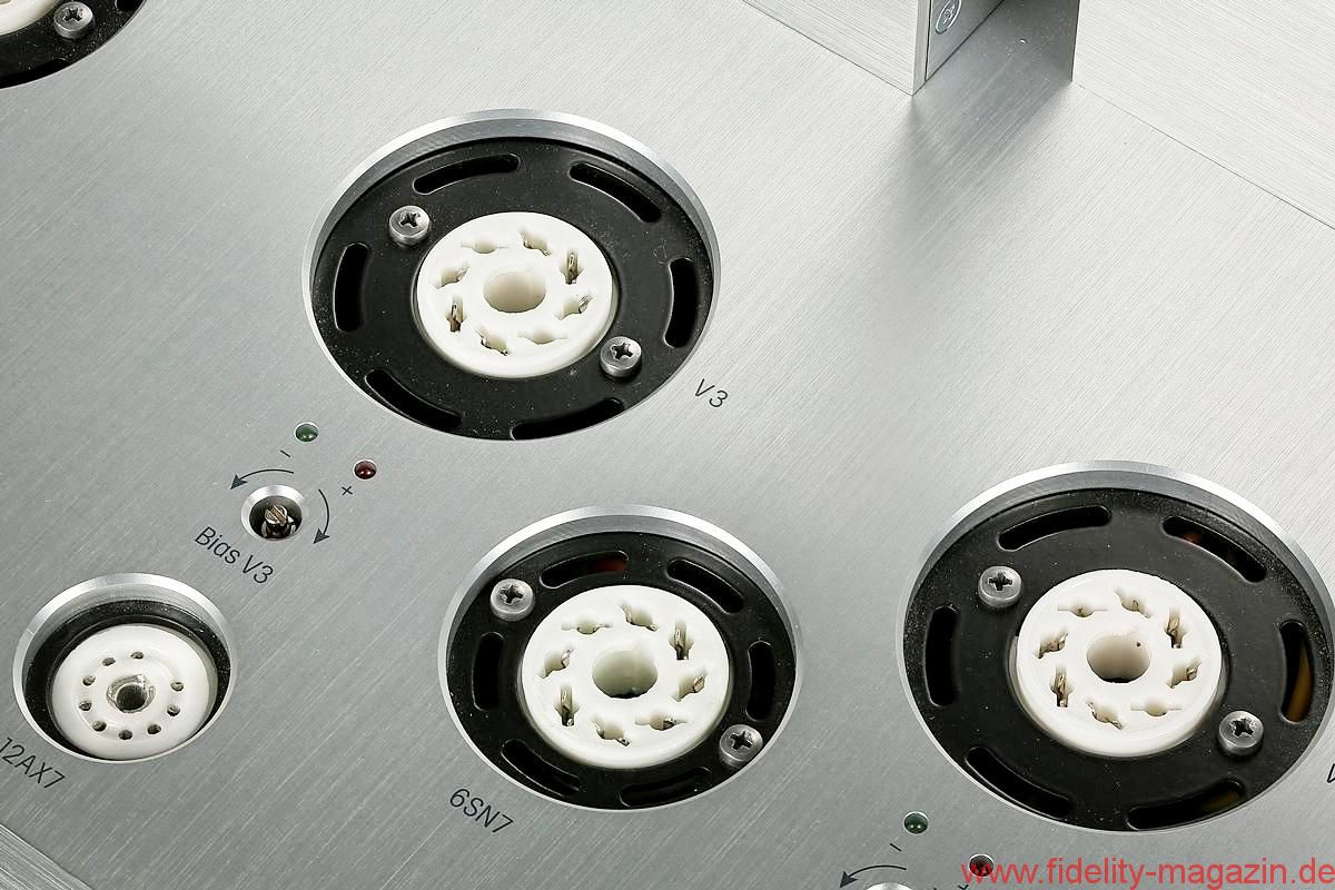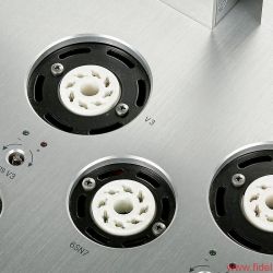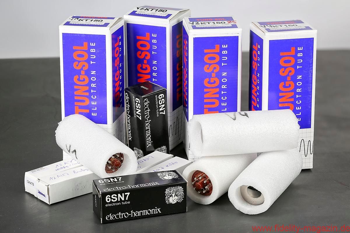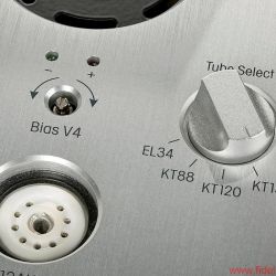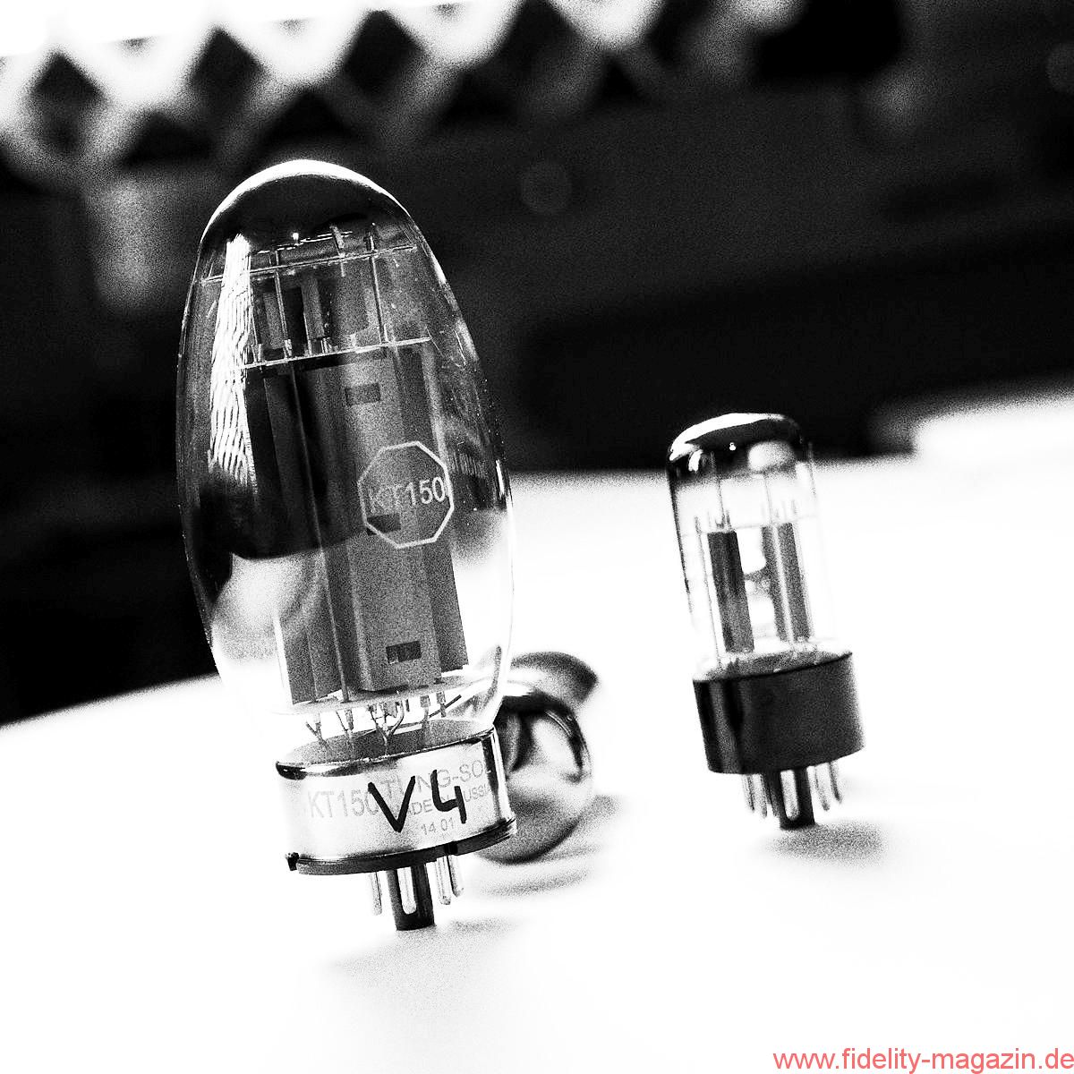 Röhrenbestückung: 4 x KT150 (optional KT88, KT120 oder EL34), 2 x 6SN7, 2 x 12AX7, 2 x 12AU7
