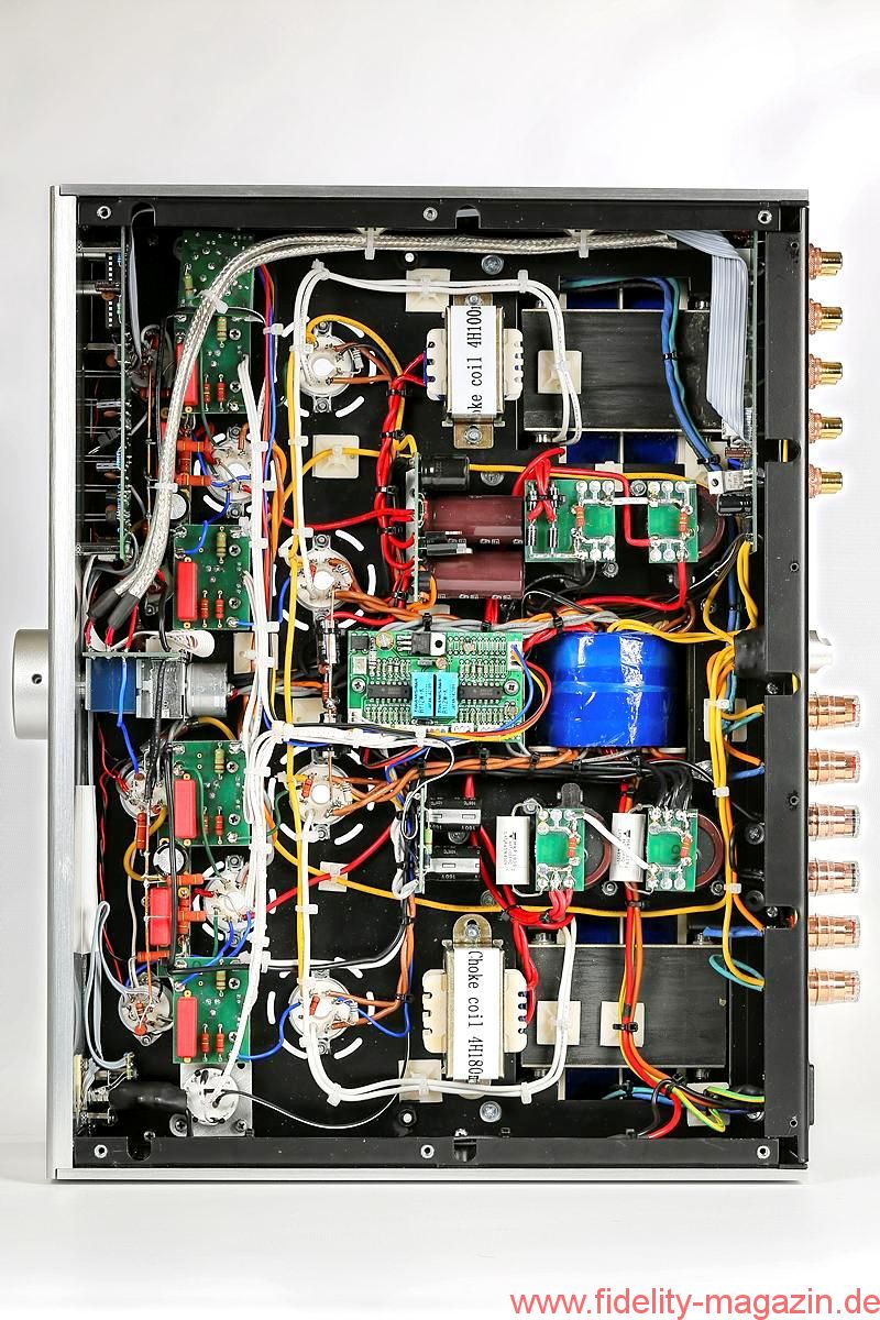 Geht es um die Abstimmung klanglicher Eigenschaften eines neuen Konzepts, kann sich Entwickler Stefan Noll stets auch auf das trainierte Ohr seines Partners Thomas Deyerling verlassen. In ihren Sitzungen werden die Auswirkungen von Bauteilen diskutiert, ohne dass man auf Kosten achtet oder dem Messwertfetischismus einiger Mitbewerber verfällt. Ob Silber- oder Kupferkabel geeigneter sind oder welche Qualität bestimmter Bauteile am jeweiligen Platz natürlicher klingt – jedes Detail der Schaltung wird kritisch im Hörraum und nicht am bestens bestückten Messplatz von Lyric Audio ermittelt. Wer das Auge von der sauber ausgeführten Handarbeit lösen kann, findet Detaillösungen wie die mit Federwinkeln vom restlichen Gehäuse entkoppelten Übertrager oder teure, aber hoch belastbare Nichicon-Elkos.
