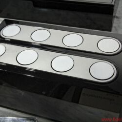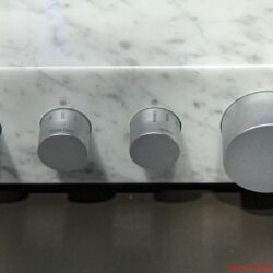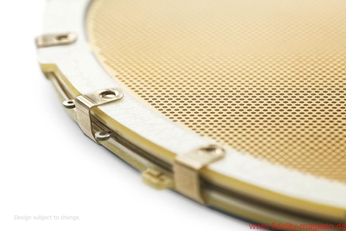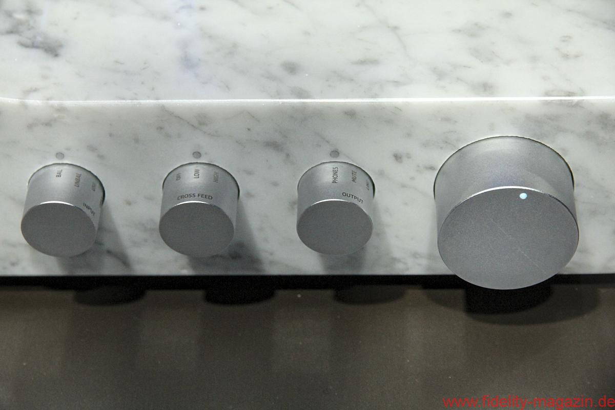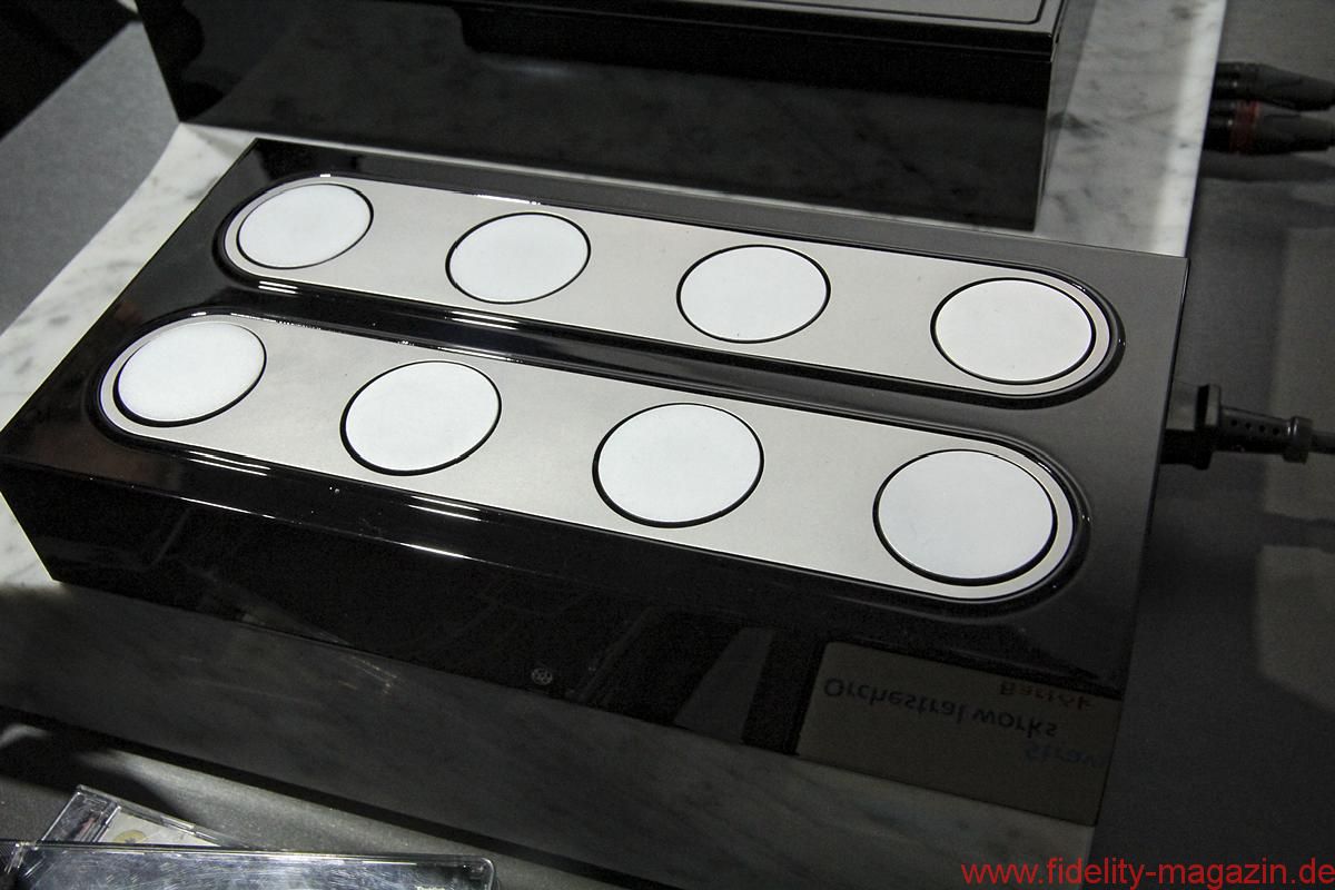 Damit ist’s auf Knopfdruck vorbei. Eine spezielle Warm-up-Choreografie verwandelt Michelangelos Schneewittchensarg in einen fidelen Transformer. Gemächlich schieben sich die vier Drehknöpfe aus der Marmorfront. Auf der rechten Oberseite fährt ein Gläser-Oktett aus der Versenkung des schwarzen Alu-Blocks und betritt die Orpheus-Bühne in bester Theater-Manier. Schließlich öffnet sich linkerhand die gläserne Klappe und gibt Schneewittchen, den staubgeschützten Kopfhörer, frei. Was für ein Schauspiel! Diese Art der „Entfaltung“ darf man, je nach persönlichem Temperament, faszinierend oder irritierend finden. Angemessen für das, was jetzt zu hören sein wird, ist es allemal. (Mehr dazu im Technik-Kasten.)