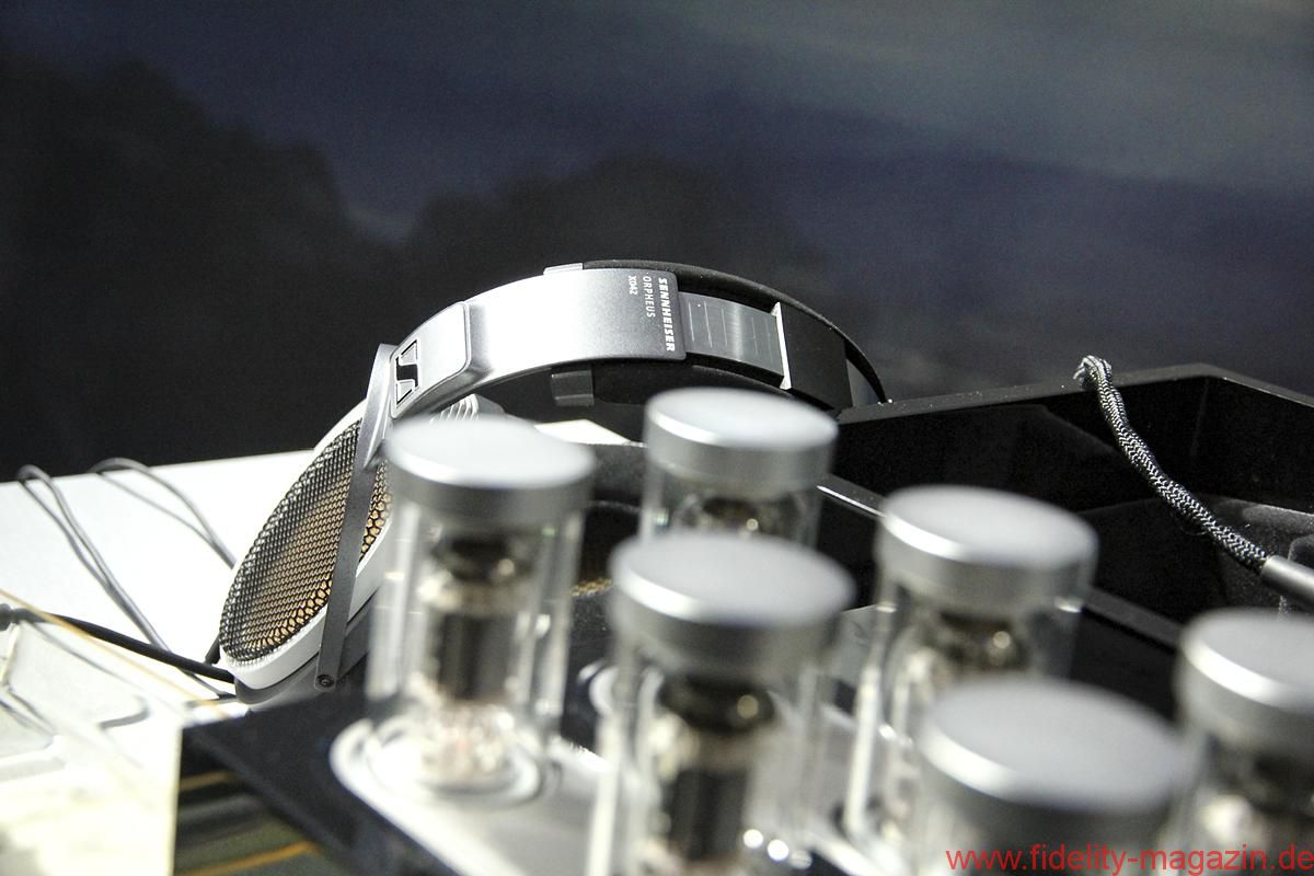 Für die bestmögliche Impulsverarbeitung des eingehenden Musiksignals bestückt Sennheiser das Verstärkerteil mit acht streng selektierten Röhren vom Typ SE803S. Um die bei Elektrostaten übliche Spannungsumladung für das Verbindungskabel auf ein absolutes Minimum zu bringen, baut Sennheiser die nachfolgende Hochvolt-Verstärkerstufe mit MOSFET-Transistoren direkt in den Kopfhörer ein. Mit nur etwa fünf Volt wird das Musiksignal über ein symmetrisches Verbindungskabel zur patentierten Schaltung in „Cool Class A“ übertragen; winzige „Kühlrippen“ oben auf den Hörmuscheln haben mehr symbolischen Charakter als echte Funktion. Da der neue Orpheus die notwendige Spannung für die elektrostatischen Wandlerelemente direkt vor Ort erzeugt, muss das Signal zwischen Hochvolt-Verstärkerstufe und Membran weniger als einen Zentimeter zurücklegen.