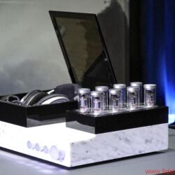 Das darf man ruhig wörtlich nehmen – dazu gleich mehr. Zuvor will ich den Orpheus noch kurz im Standby-Modus betrachten. Die Luxushülle aus Marmor, Glas und mattem Chrom wirkt zugleich kühl und streng geometrisch, aber auch ein bisschen, na ja, märchenhaft. Der unter Glas ruhende Kopfhörer erinnert mich jedenfalls an …