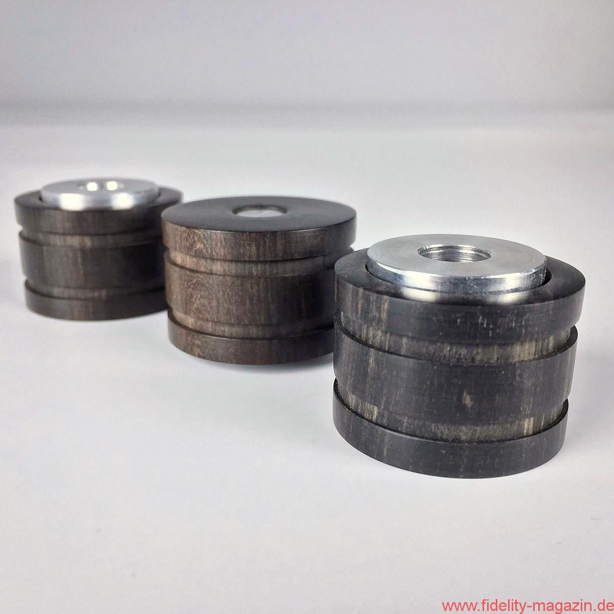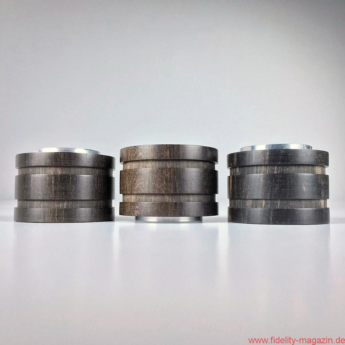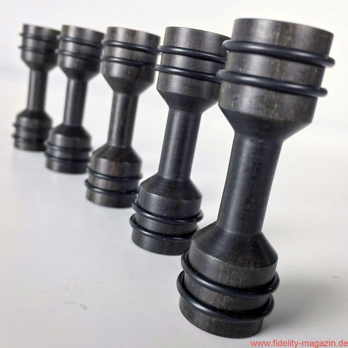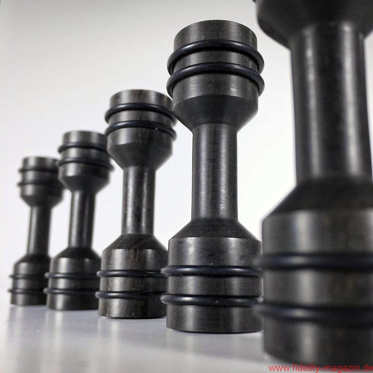 Wie schaffen das diese Füße nur? Nun, ein CF-Set soll nach dem von Subbase Audio verfolgten Ansatz der direkten Ankopplung eine möglichst homogene Verbindung des Geräts zu seiner Stellfläche herstellen. Die Füße werden alle in Handarbeit (!) gedrechselt, und zwar aus wunderbarem, mindestens zehn Jahre altem Ebenholz – ein großer haptischer Genuss! – und mit einem hülsenartigen Innaufbau aus massiven Aluminium versehen. Vergleiche mit einem Handschmeichler sind naheliegend und sicherlich erlaubt.
