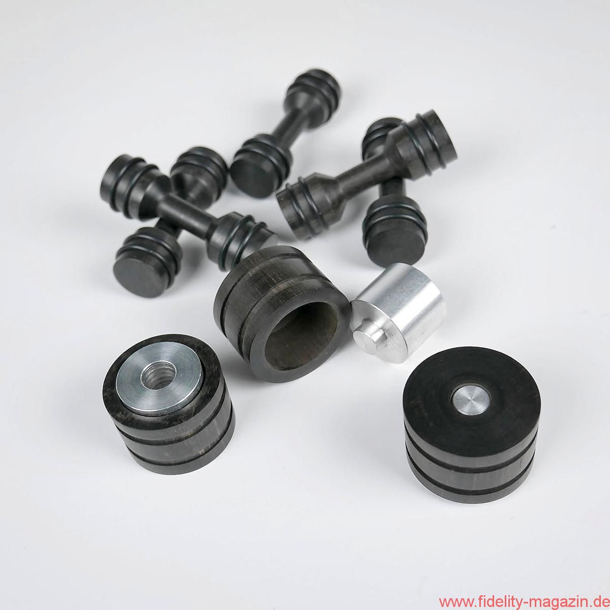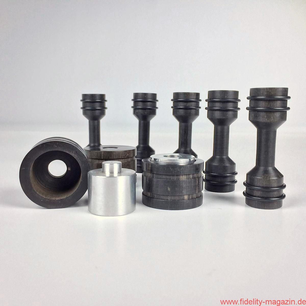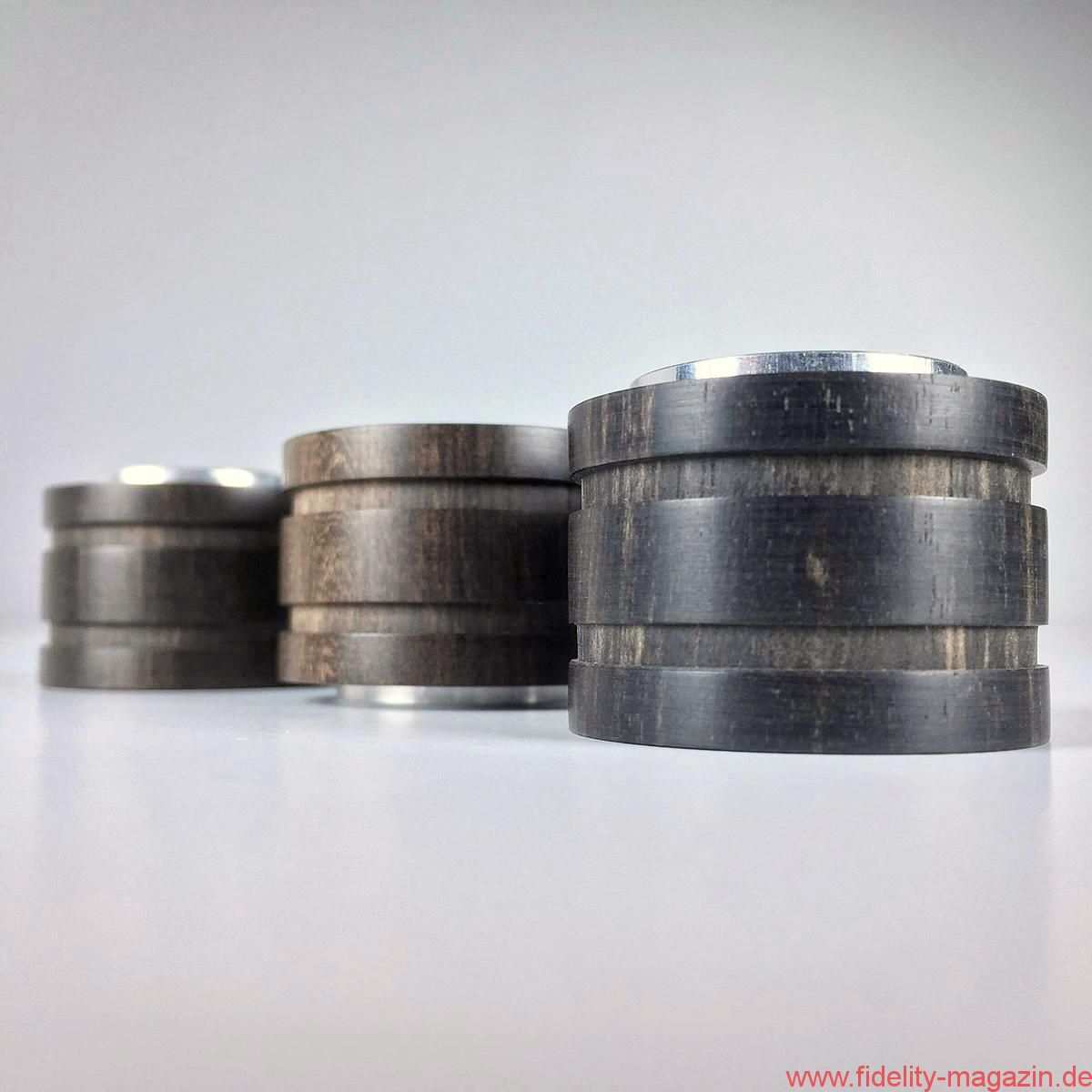 Wie schaffen das diese Füße nur? Nun, ein CF-Set soll nach dem von Subbase Audio verfolgten Ansatz der direkten Ankopplung eine möglichst homogene Verbindung des Geräts zu seiner Stellfläche herstellen. Die Füße werden alle in Handarbeit (!) gedrechselt, und zwar aus wunderbarem, mindestens zehn Jahre altem Ebenholz – ein großer haptischer Genuss! – und mit einem hülsenartigen Innaufbau aus massiven Aluminium versehen. Vergleiche mit einem Handschmeichler sind naheliegend und sicherlich erlaubt.