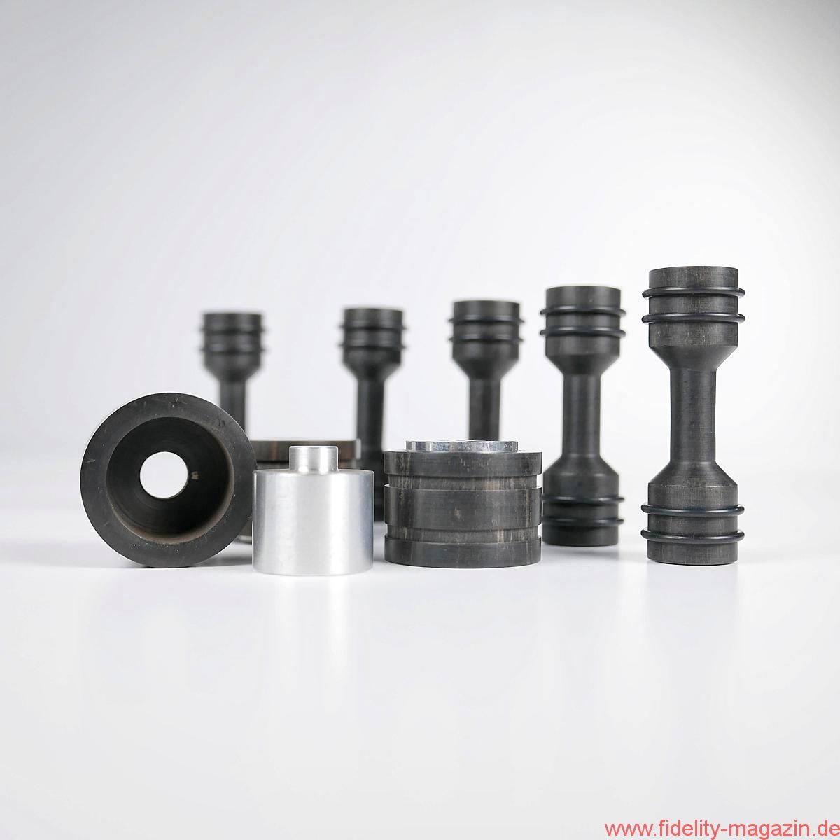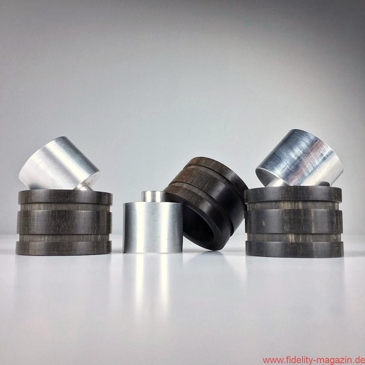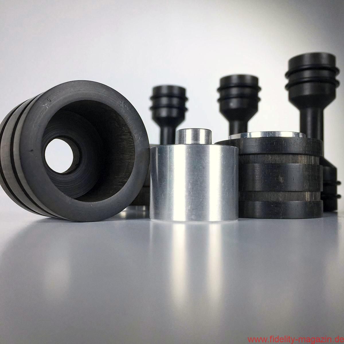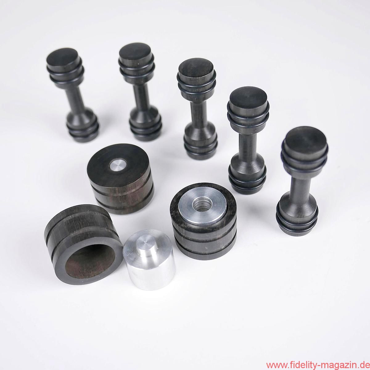 Wie schaffen das diese Füße nur? Nun, ein CF-Set soll nach dem von Subbase Audio verfolgten Ansatz der direkten Ankopplung eine möglichst homogene Verbindung des Geräts zu seiner Stellfläche herstellen. Die Füße werden alle in Handarbeit (!) gedrechselt, und zwar aus wunderbarem, mindestens zehn Jahre altem Ebenholz – ein großer haptischer Genuss! – und mit einem hülsenartigen Innaufbau aus massiven Aluminium versehen. Vergleiche mit einem Handschmeichler sind naheliegend und sicherlich erlaubt.