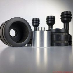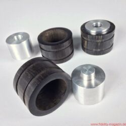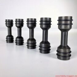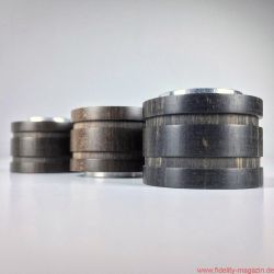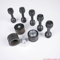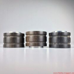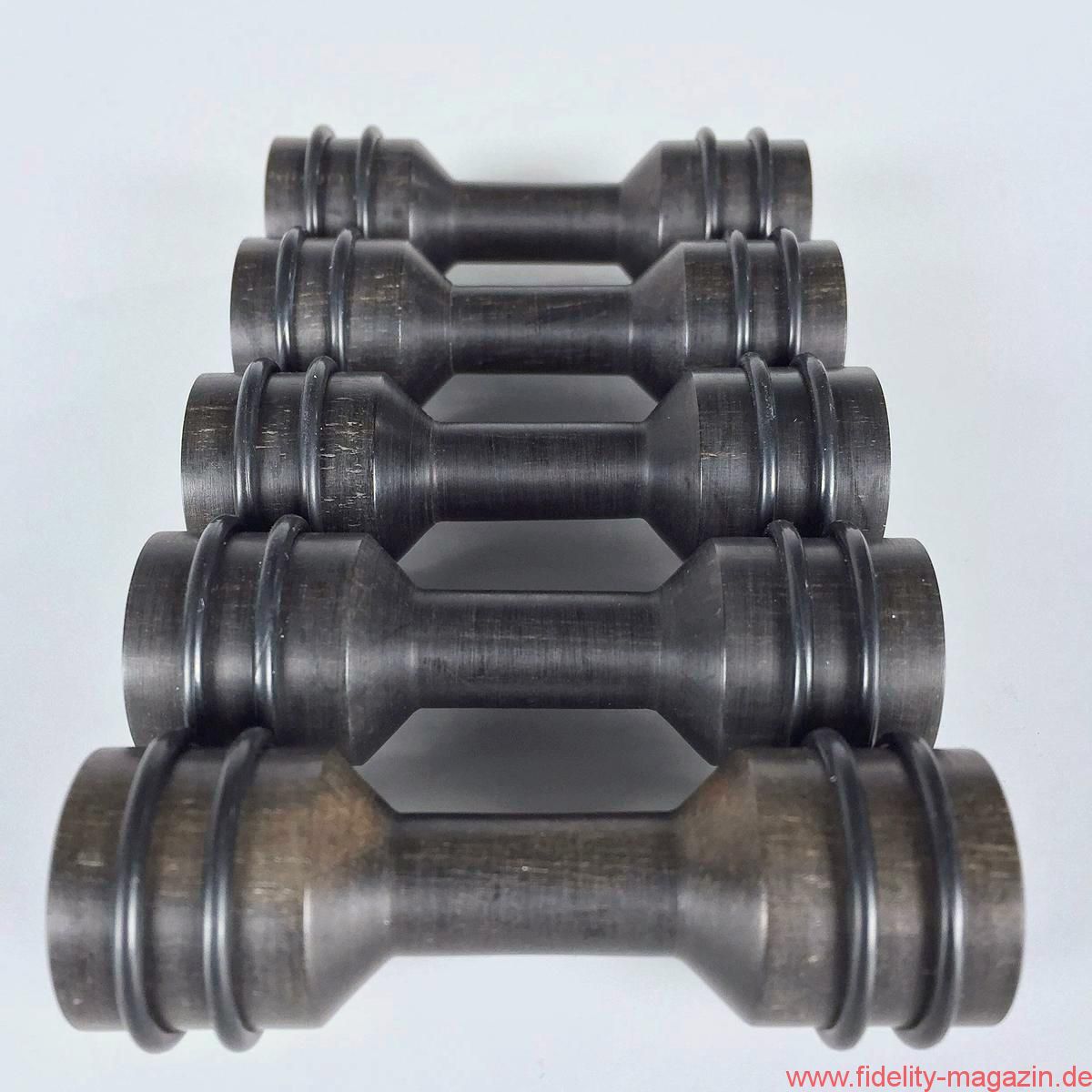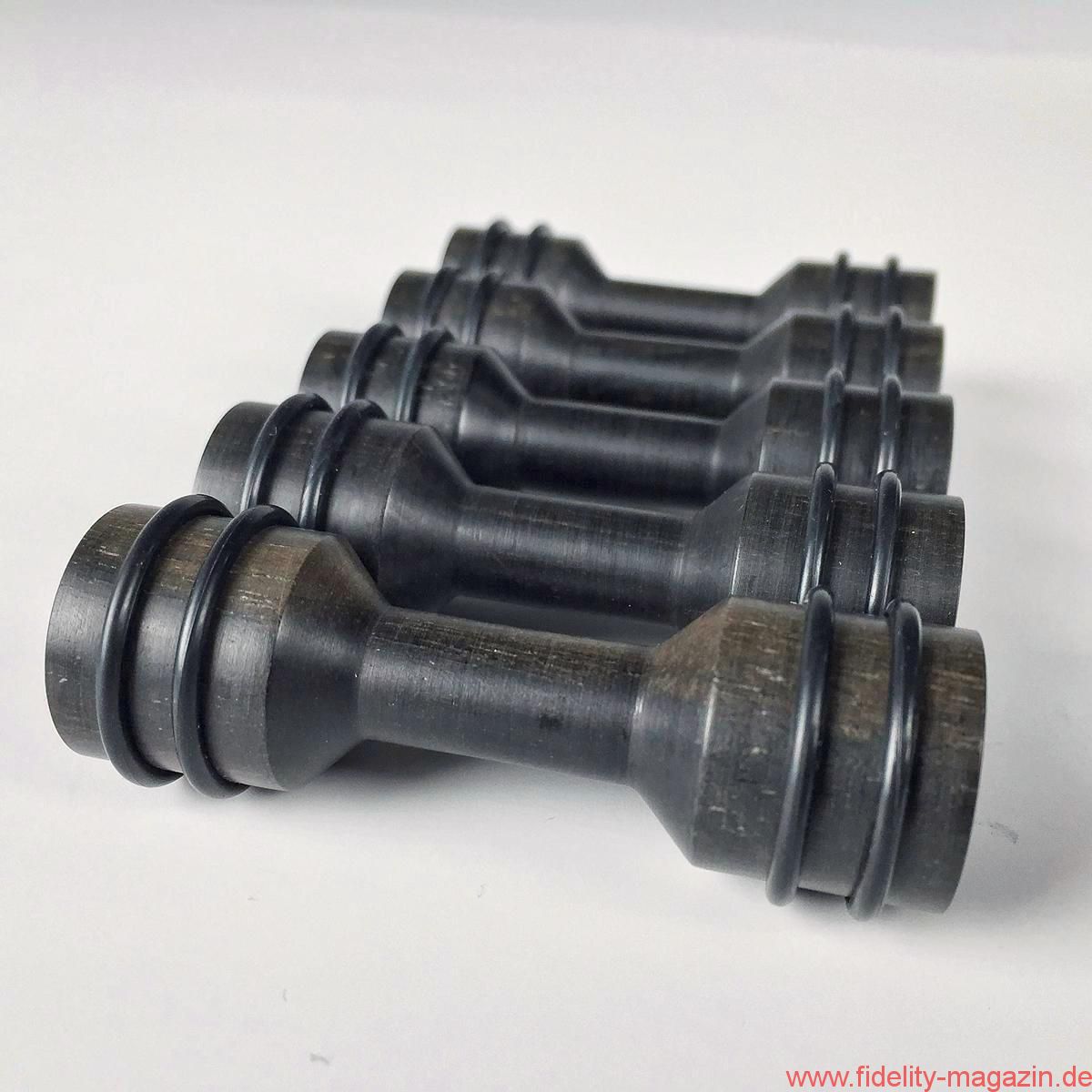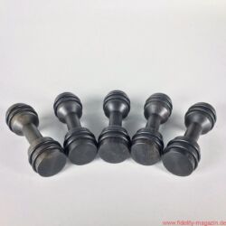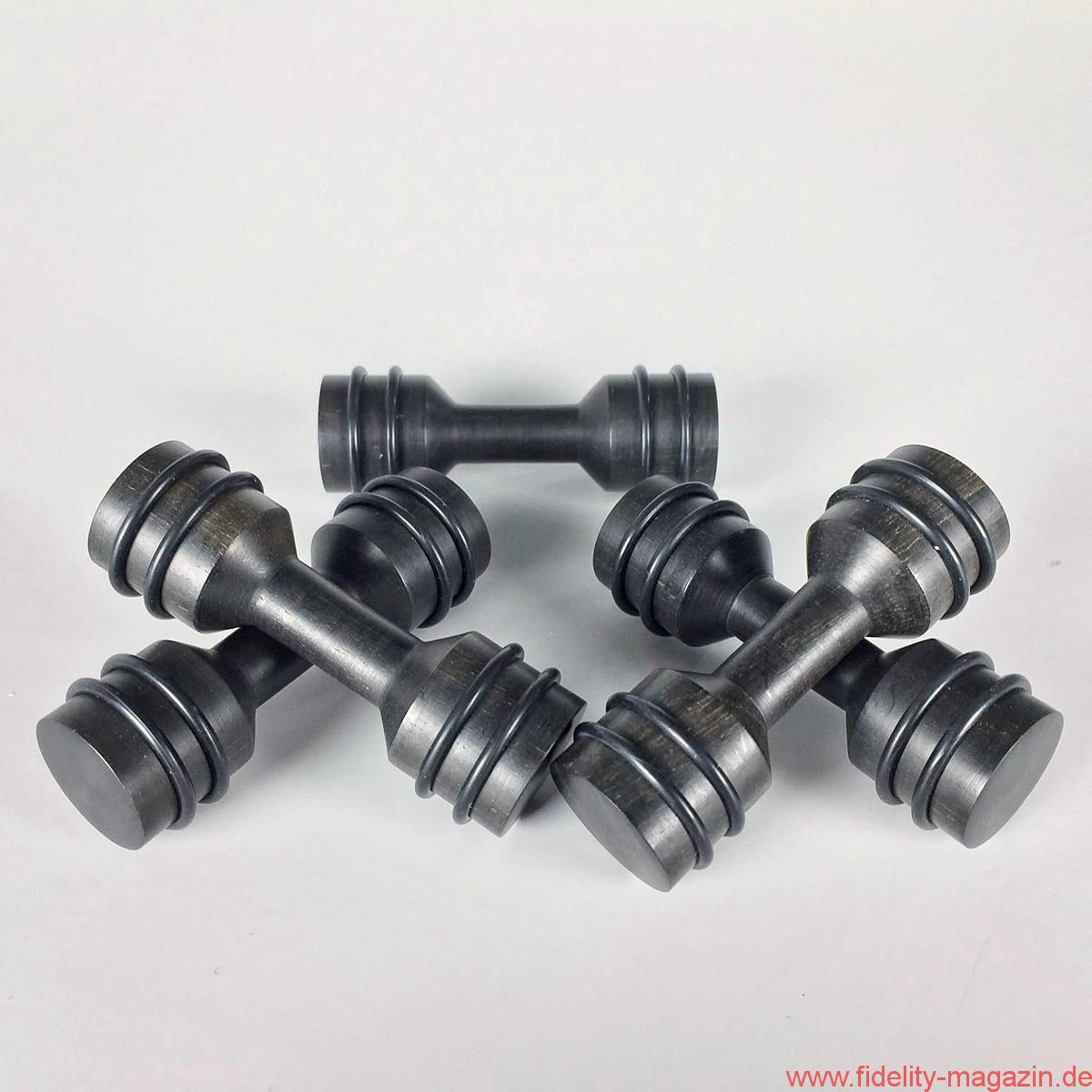 Sollten etwa diese kleinen, wie Hanteln aussehenden Teile für eine weitere Überraschung sorgen? – Und wie! Die von Subbase Audio auf den Namen „Pont“ getauften Kabelbasen werden aus Ebenholz gefertigt, mit je vier Ringen aus Gummi bestückt und passen nicht nur optisch wunderbar zu den CF-Füßen.