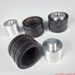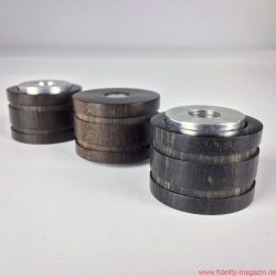 Im Idealfall steht das betreffende Gerät direkt mit seiner Bodenplatte auf dem Aluminium-Innenteil des CF, während das umhüllende Ebenholz Kontakt zur Stellfläche (bei den Subbase Basen geschliffener Schiefer) aufnimmt. Wenn man nun die Füße immer nur wenige Millimeter unter dem Geräteboden verschiebt (gerne nah an den Kanten!), ist die ideale Position für jedes Gerät recht schnell zu ermitteln. Auch die Anzahl der Füße kann variieren und hat einen Einfluss auf den Klang. Bei meiner Shindo-Röhrenvorstufe haben sich beispielsweise drei nahe der Kanten positionierte CF als optimal erwiesen, beim CD-Player Vadi von AcousticPlan hingegen führen vier CF-Füße zum Optimum. Wie fast immer ist Ausprobieren angesagt.