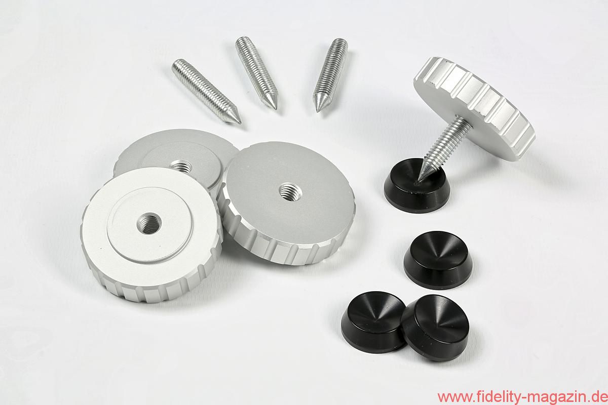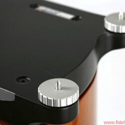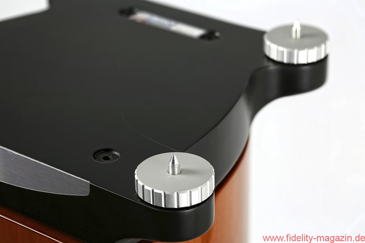 Dass die DC8 Ti dennoch ein „i“ für „improved“ trägt, hat mit der grundsätzlichen Technik nichts zu tun, sondern bezieht sich auf die kryogen behandelte Weiche mit nicht näher spezifizierter verbesserter Bestückung, eine versilberte Kupfer-Innenverkabelung und Ausleger für die Spikes. Eventuell habe ich noch eine Kleinigkeit vergessen. Vermeintlich hätte man es bei der Modellpflege belassen können, aber Tannoy hält es auch hinsichtlich der klanglichen Verbesserung für richtig, diesen Zwischenschritt in der Entwicklung zu dokumentieren. Mangels Kenntnis kann ich über die Vorgängerin nichts sagen, aber mir ist ein verbessertes Produkt allemal lieber als ein verbesserungswürdiges. Zumindest die Spinnenbeine der konzentriert beschwerten Bodenplatte sind in praktischer Hinsicht ein großer Fortschritt. Im Nu ist die Box bequem von oben nivelliert und mit griffigen Rändelmuttern von unten gekontert. Optisch haftet dieser zweifellos sicheren Standhilfe hingegen oft etwas tapsig-pantoffeliges an, das auch die Eleganz der DC8 Ti in Hochglanz-Kirsch geringfügig konterkariert.