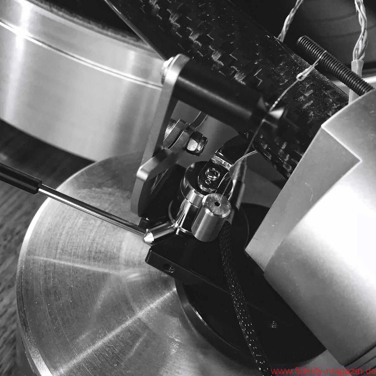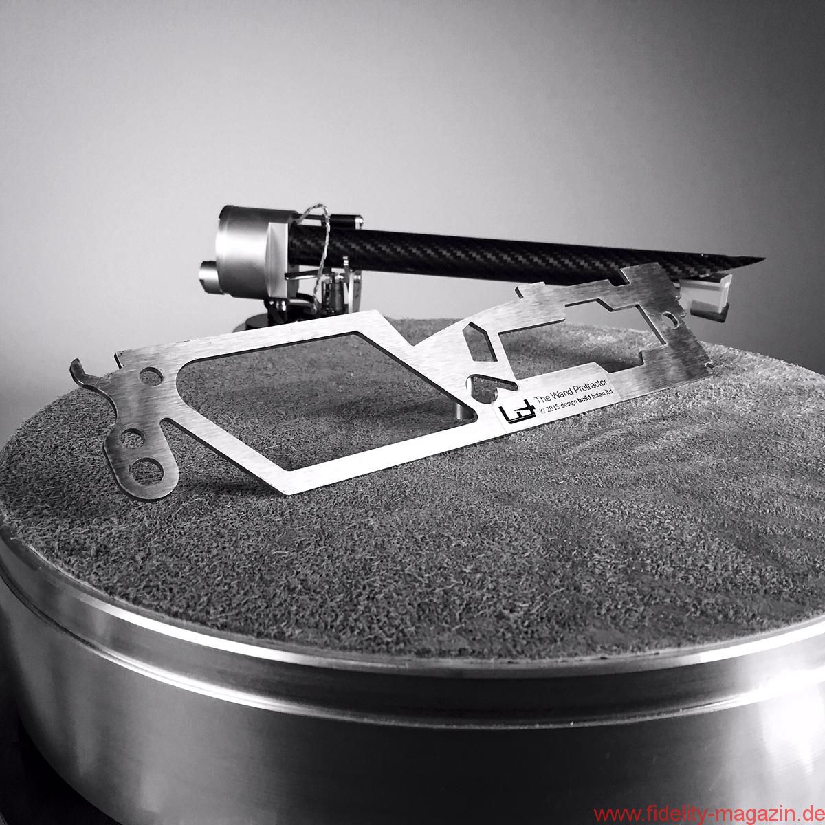 Aber auch ohne diese Spezialanfertigungen lässt sich The Wand auf den meisten Plattenspielern problemlos montieren. Man benötigt lediglich eine Bohrung zwischen 23 und 30 Millimetern im „Rega-Abstand“ von 222 Millimetern, da der dünne Lagerschaft, der wiederum gleichzeitig die Armhöhe bestimmt, exzentrisch auf einer Montagescheibe sitzt. Und jetzt wird es etwas eigenwillig, aber nach mehrfachem Systemwechsel und Gegenprobe auch einfach und, Verzeihung, idiotensicher. Im Lieferumfang befindet sich ein zackiges und gelochtes Edelstahlprofil, das an einen flachen Mehrzweck-Schraubenschlüssel aus der Fahrrad-Satteltasche erinnert. Man könnte es für Verschnitt aus der Fertigung halten, denn es sieht aus, als wären eine Reihe Formen daraus gestanzt worden, doch es handelt sich um eine sehr durchdachte Justagelehre, mit der sämtliche Einstellungen, bis auf Azimut und Antiskating, zum Kinderspiel werden. Man beginnt mit Achsabstand sowie VTA, und mit etwas Glück, sprich einem System, das dem Standard entspricht, ist damit schon der größte Teil erledigt. Falls der Überhang nicht genau passt, muss man noch einmal an die Armbasis, da an der Systemaufnahme – wie bereits angedeutet – kein Spielraum bleibt. Man drehe nun die exzentrische Basis vorsichtig, bis die Nadel mit einem kleinen Ausschnitt des Thaleskreises auf der Schablone übereinstimmt. Armhöhe überprüfen, fertig. Sofern das Systemgewicht bekannt ist, kann man sich hinsichtlich der Auflagekraft an einer Tabelle orientieren; falls nicht, beginnt man mit zwei der drei großen Edelstahlplättchen. Sie werden einfach an der Lagerglocke fixiert, die Feineinstellung erfolgt dann über eine große Schraube ganz hinten am Arm. Hab ich was vergessen? Ach ja, Antiskatingkraft wird klassisch über ein Fadengewicht ausgeübt und der Azimut mittels einer kleinen Inbusschraube justiert. Insgesamt gelingt die Montage des neuseeländischen Arms sehr einfach, sobald man sich mit seiner Eigenheit, alle Optionen um den Drehpunkt zu konzentrieren, arrangiert hat.