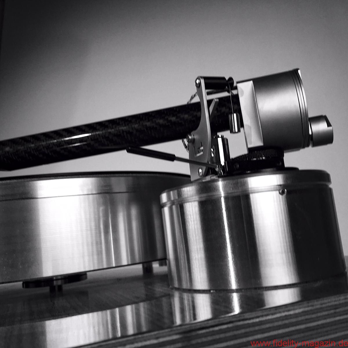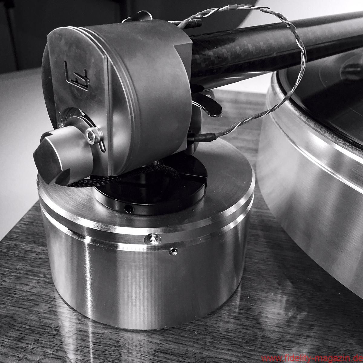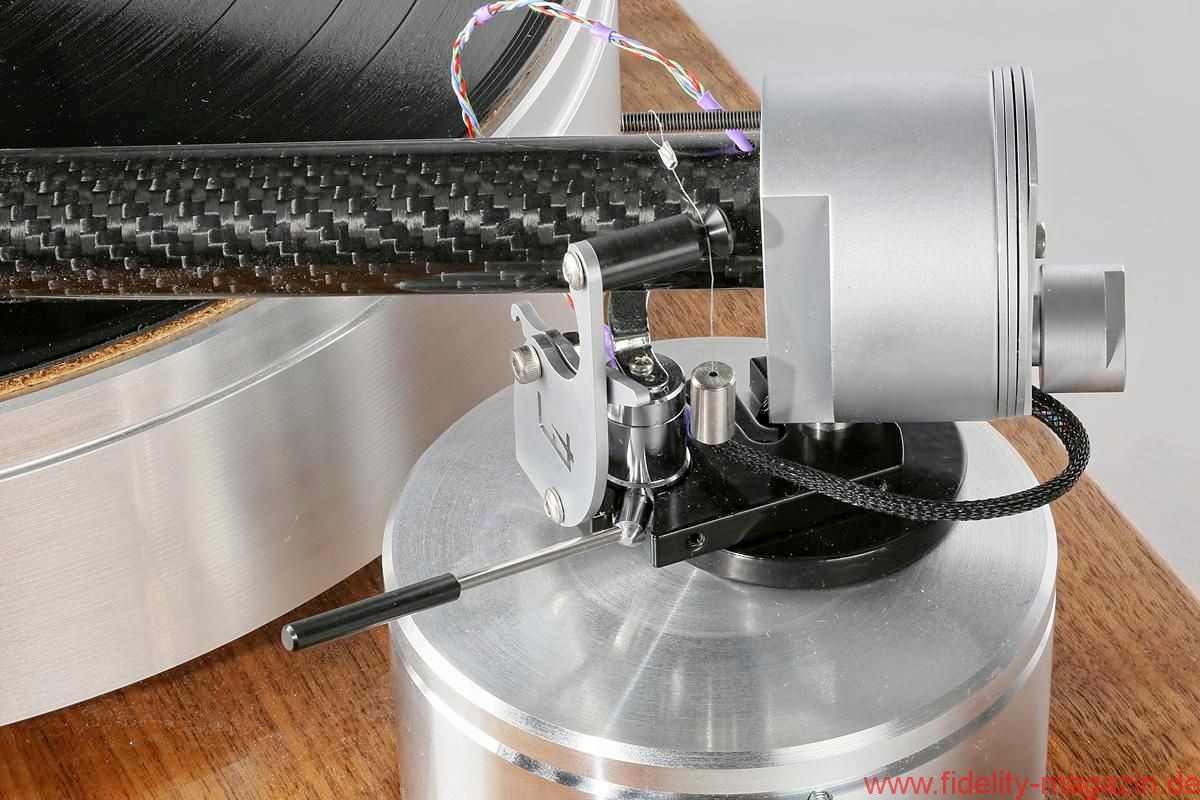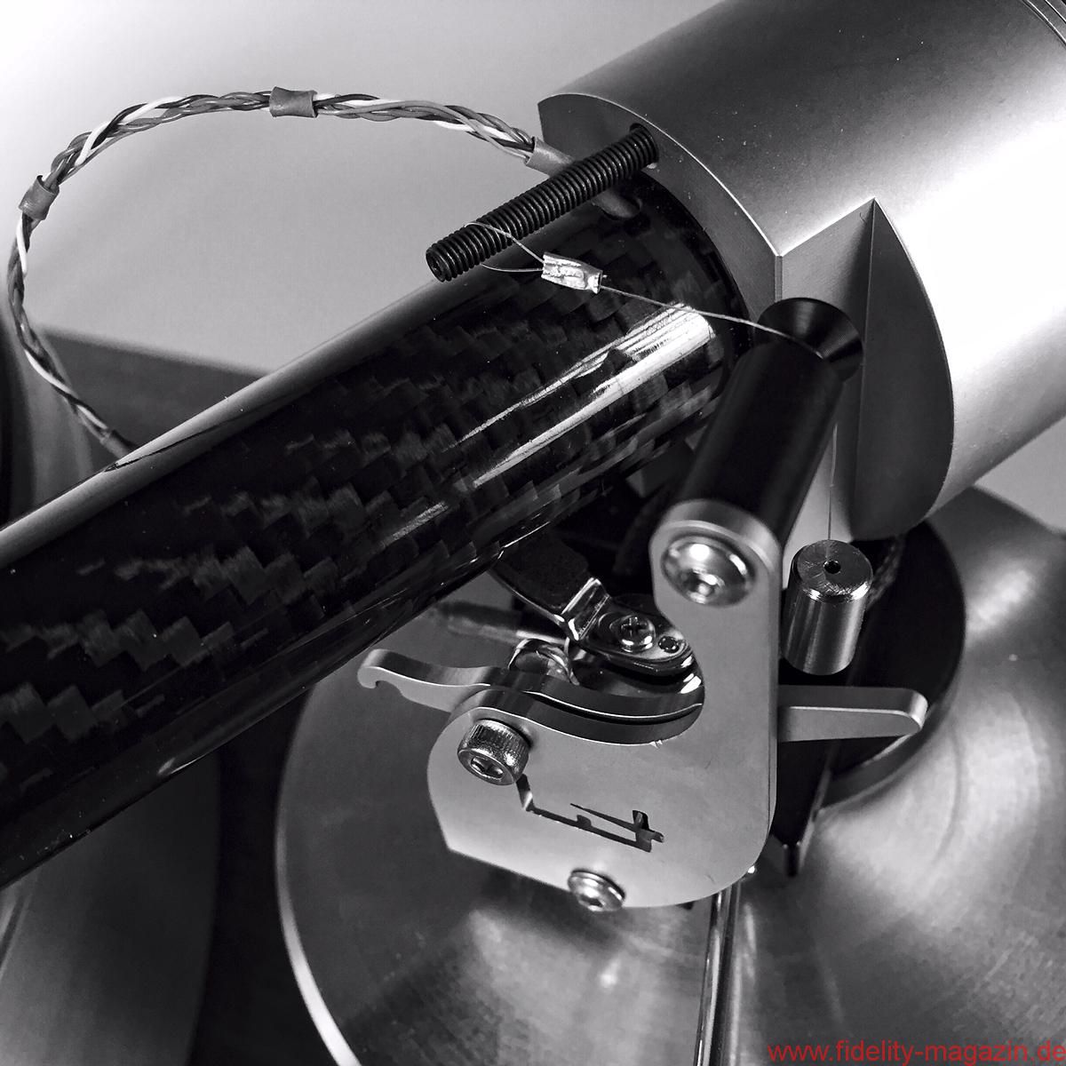 Oder erinnern Sie sich an die beeindruckenden Continuum-Laufwerke, deren Tonarm – ich glaube, er hieß Cobra – durchaus Ähnlichkeiten mit The Wand, dem neuseeländischen Testobjekt, aufwies. Hauptsächlich wegen des aststarken Armrohrs, dessen Umfang die meisten anderen Tonarme zu Stricknadeln degradiert. Der muskulöse Auftritt scheint mir eine Spezialität dortigen Designs zu sein. Brown behauptet, sein Tonarm sei viermal so verwindungssteif wie „normale Tonarme“, was eine Bezugsgröße, auf die man ihn festnageln könnte, aber vermissen lässt. „Extrasteif“ notiere ich im Geiste dennoch als versprochene Eigenschaft. The Wand besteht aus einem einteiligen, 22 Millimeter durchmessenden Carbonrohr, an dessen vorderem, in flachem Winkel abgeschrägtem Ende der Tonabnehmer in einem Metallträger mit Halbzollbohrungen Platz findet; die Kröpfung orientiert sich an der Baerwald-Geometrie, und es gibt keine Headshell mit Langlöchern. Die Lagerglocke aus antimagnetischem Edelstahl bildet zugleich das Gegengewicht des ungewöhnlichen Einpunktlagers; auch der Nadelazimut wird direkt am Drehpunkt justiert. Jedes Bauteil wirkt sich klanglich aus, ergo steht alles Überflüssige dem neutralen Klang im Weg, so lautet ein in langen Jahren intensiver Entwicklung gewonnener Grundsatz Browns. Dem er mit der kuriosen von unten her umschließenden Armarretierung gleichwohl untreu wird. Mein Tipp: Einmal zurückschieben und dann vergessen. Auf nur 500 Gramm Gewicht bringt es der reduzierte Arm und sollte auch von den meisten Subchassis-Laufwerken ausbalanciert werden können. Brown bietet sogar eine passende Basis für das Armboard des LP12 an – ziemlich selbstbewusst! Ebenso gibt es für Technics’ 1200er-Familie ein spezielles Mounting-Kit – diese Kombination kann ich mir sehr gut vorstellen, und zumindest optisch macht sie aus dem Massenprodukt von Panasonic einen originellen und individuellen Dreher.