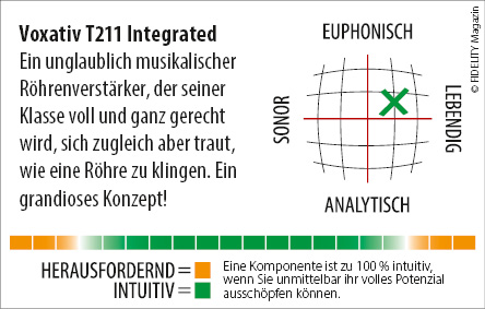 Dem vorzüglichen Klang stehe eine extrem geringe Ausgangsleistung gegenüber, die bei den Wirkungsgradmonstern von Voxativ allerdings kein Problem darstelle. Die Pi (um 90 dB) oder ihre Ablegerin, die 9.87 (bis 110 dB), holen aus dem Verstärker gehörig was heraus. Die Leistung des T211 Integrated auf einen Wert festzunageln sei derweil kaum möglich. Man gehe bei Röhren immer mit einem zugedrückten Auge an die Messung – zwei, drei Prozent Klirr seien hier eher Regel als Ausnahme.