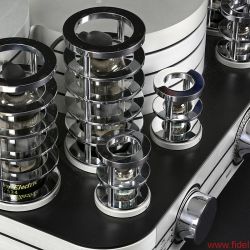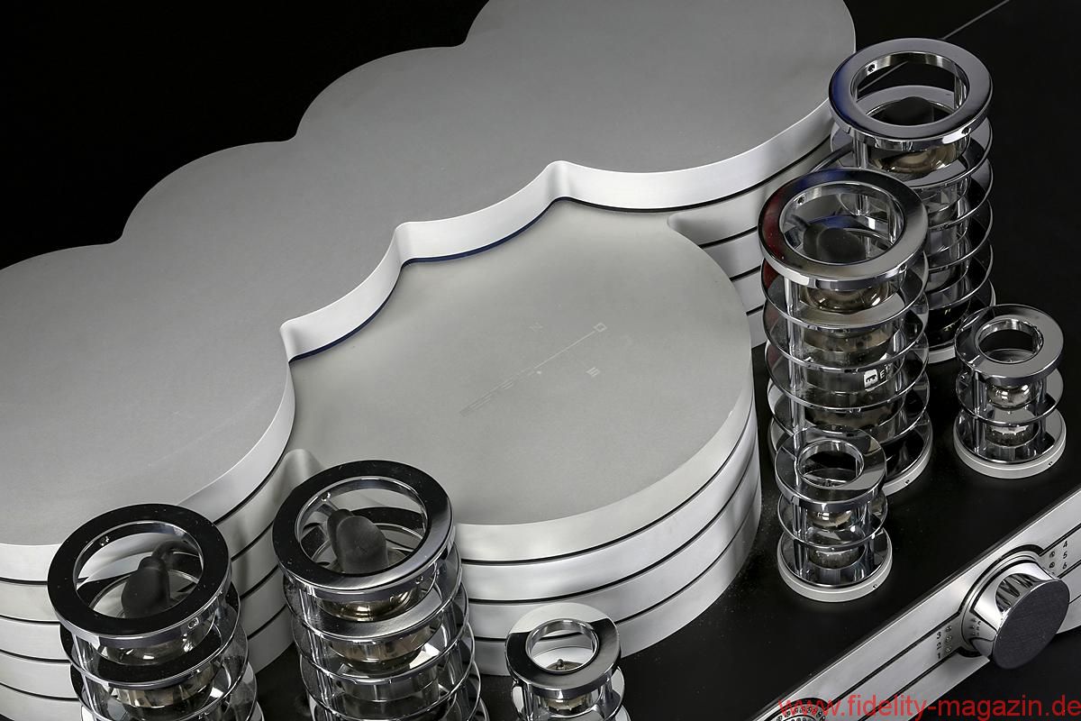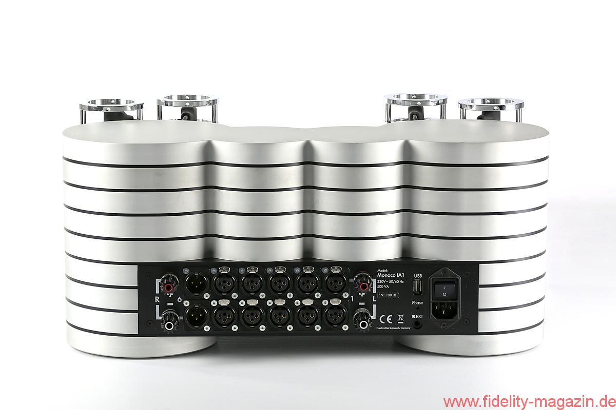 Wir merken uns: HiFi-Historie und High-End-Moderne müssen sich keineswegs ausschließen. Wie der aktuelle Monaco lustvoll beweisen will. Er steht uns in einem Bicolor-Gehäuse zur Verfügung und scheint nur darauf zu warten, sich endlich auch musikalisch gebührend in Szene zu setzen. Bevor es aber losgeht mit dem Musikhören noch ein paar Worte zur mechanischen Konstruktion, die schlichtweg superb ausgeführt ist. Das unglaublich massive Gehäuse besteht beispielsweise aus übereinandergeschichteten Aluminium-Frästeilen, die in allen möglichen Eloxalfarben lieferbar sind und in Verbindung mit den dünneren, auf Wunsch andersfarbigen Zwischenschichten reizvolle Kontraste zum ohnehin aufsehenerregenden Äußeren dieser „Röhrenburg“ beisteuern. Die in Front und Rückseite eingelassenen Montageplatten tragen sämtliche Bedienungs- und Anschlusselemente und sind ebenfalls in allen möglichen Oberflächen lieferbar. Dass es sich bei den Drehknöpfen auf der Front um massives Metall und bei allen Buchsen um allerfeinste High-End-Ware handelt, versteht sich beim Qualitätsanspruch der Münchner Manufaktur wohl von selbst.