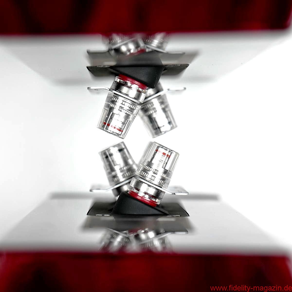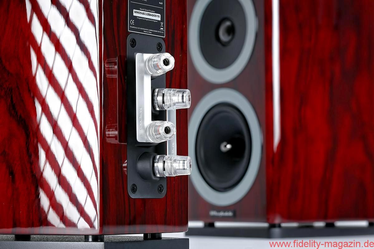 doppelten Anschlussterminals (für Bi-Wiring bzw. Bi-Amping) sind ebenso solide wie elegant. Passenderweise wird ein Pärchen weißer Baumwoll-Handschuhe mitgeliefert, um die ganze Pracht nicht schon beim Auspacken und Aufstellen mit Fingerabdrücken zu verunzieren. Ich wasche mir allerdings meine Hände lieber nach Chirurgenart, denn zwei knapp sechs Kilo schwere Lautsprecher, deren Kanten allesamt fein verrundet sind, mit Handschuhen auf ihre Ständer zu stellen, ist mir zu riskant.