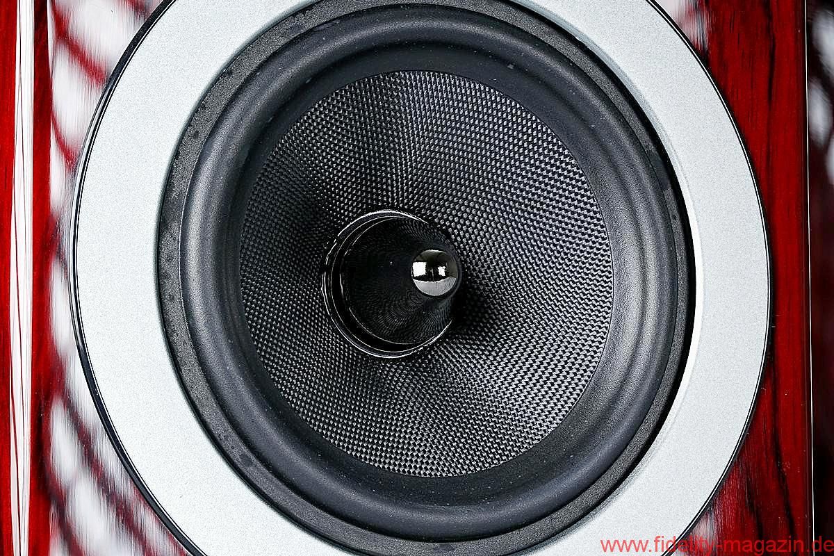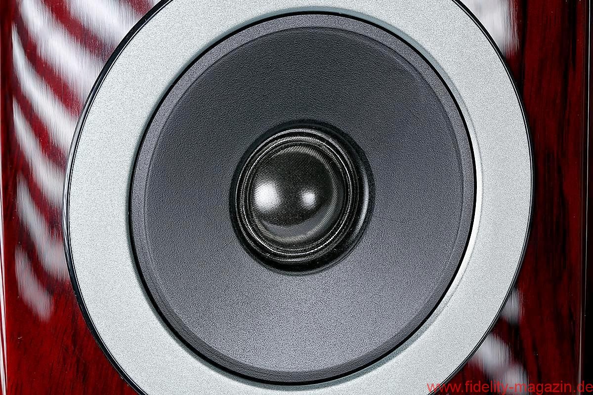 Die Membran des 11,5 cm durchmessenden Tiefmitteltöners (Korbdurchmesser) besteht aus einem äußerst feinen Glasfasergewebe, ein Druckgusskorb ist in dieser Klasse ein Muss, ein Phase Plug ein gern gesehenes Detail. Die 25-mm-Textilkalotte wird von einem Neodym-Magneten angetrieben. Beide Chassis können mit einer magnetischen Abdeckung geschützt werden.
