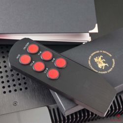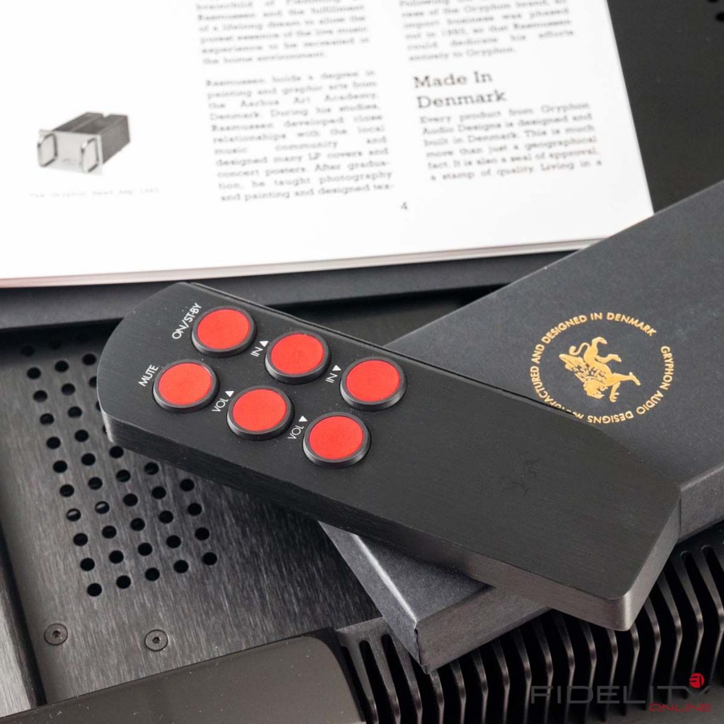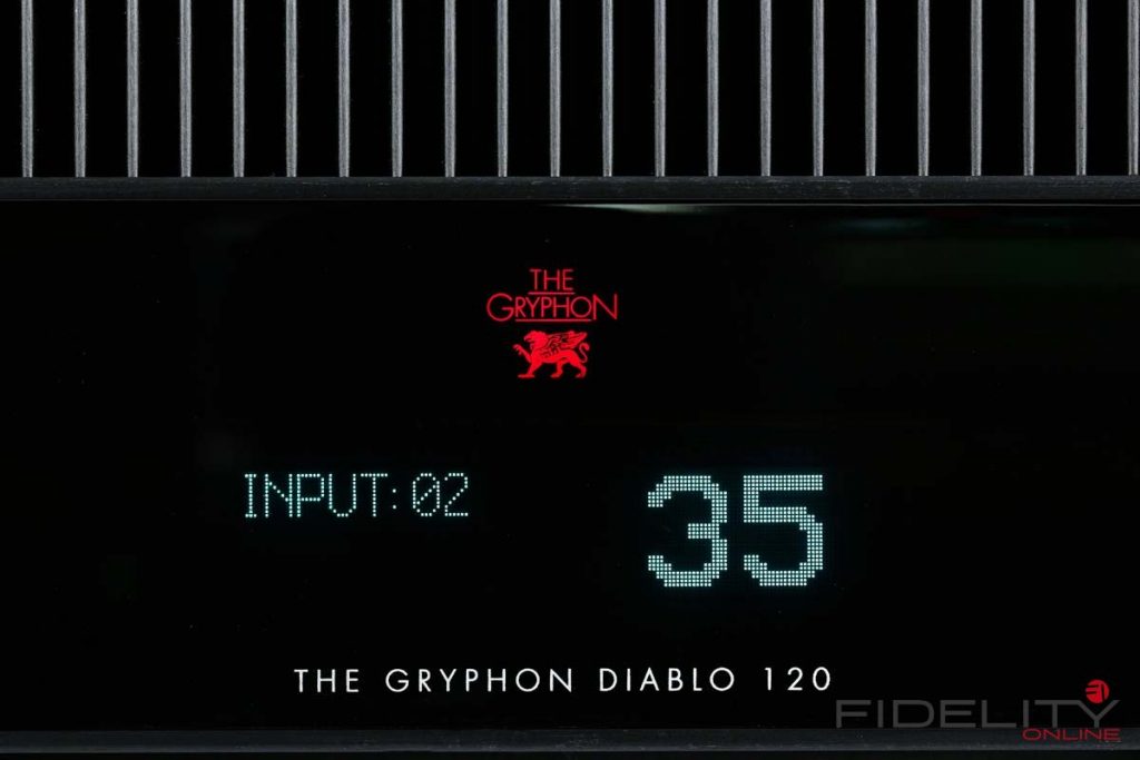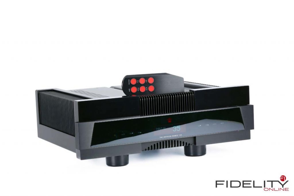 In diesem Feld zielt der Diablo 120 auf eine Spitzenposition, Verarbeitung und Bedienung sind ein Traum. Bisher dachte ich immer, ohne einen geschmeidig laufenden Lautstärkeregler ginge gar nichts. Doch die berührungssensitive Bedienlogik des kleinen Gryphon fasziniert mich mindestens ebenso wie das dezente Klacken der Relais. Die digitale Vakuum-Fluoreszenz-Anzeige auf der Frontmitte scheint mir ideal groß zu sein und wird neben Pegel und Eingangswahl bei eingebautem Wandlermodul mit den wichtigsten Aggregatzuständen wie Abtastrate, Bitauflösung und Filterwahl ergänzt. Die Gehäusekonstruktion mit den verschachtelten Kuben im idealen Kontext mit den Kühlrippen ist nach meiner Meinung ein zeitloses Meisterwerk. Ein weiteres Beispiel ist die Fernbedienung. Die kann man in Bezug auf Haptik, Minimaldesign und Funktion nicht besser machen. Das ganze Gerät strahlt auch funktional eine ganz besondere Eleganz aus.