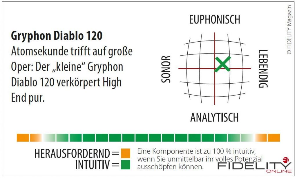 Beide Ereignisse, Oper und Atomsekunde, führen uns direkt zum Diablo 120. Denn meine Erwartungshaltung gegenüber dem neuen kleinen Vollverstärker von Gryphon wird damit recht exakt umrissen: ein Vortrag mit emotionaler Musikalität bei gleichzeitig eingebetteter atomarer Genauigkeit. Ob der neue Vollverstärker diese hochgesteckte Erwartung einlösen kann?