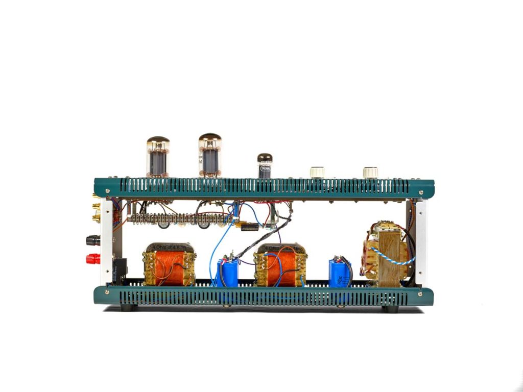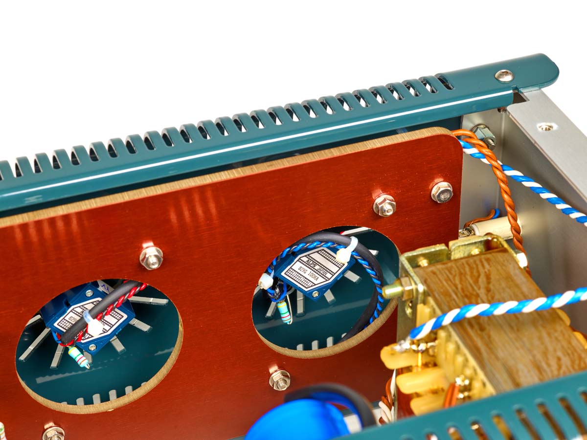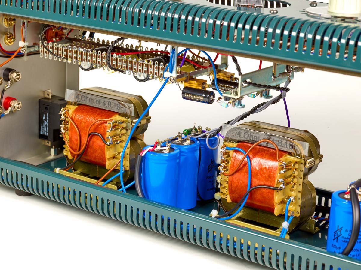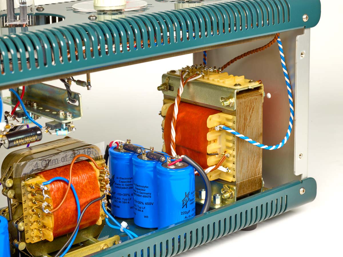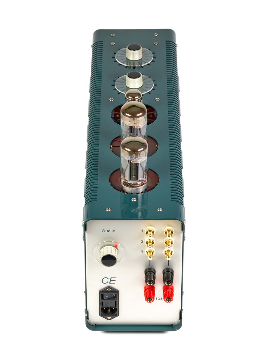 Die F2A11-Endstufenröhren werden in Triodenschaltung betrieben und liefern eine Ausgangsleistung von 6 Watt pro Kanal. In der Stromversorgung sitzen hochwertige Gleichrichterdioden und Elektrolytkondensatoren. Die Ausgangstransformatoren verfügen über bandgewickelte Schnittkerne und ermöglichen die präzise Anpassung einer Last von 4, 8 oder 16 Ohm an die Leistungsröhre über an die Sekundärklemmen gelötete Jumper. Der Netztrafo, obwohl vibrationsarm und streufeldarm konzipiert, ist vom Gehäuse mit Schwingungsdämpfern mechanisch entkoppelt. Die Schaltung ist bis auf das Äußerste reduziert und arbeitet ohne Gegenkopplung. Warum aber Siemens-NOS-Tetroden vom Typ F2A11, die einst die legendären Klangfilm-Kinoverstärker befeuerten? Ihr niedriger Innenwiderstand ist vergleichbar mit dem von 300B-Röhren. Dieser Parameter wirkt sich drastisch auf die Übertragungsverzerrung und den Frequenzgang der Endröhrenstufe aus. Vor allem aber sind die Antriebsanforderungen der F2A11 im Vergleich zu einer 300B-Röhre um den Faktor vier niedriger. Das Ergebnis ist eine viermal geringere Treiberverzerrung bei gleicher Leistung als bei der weit verbreiteten 300B.