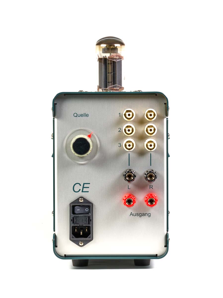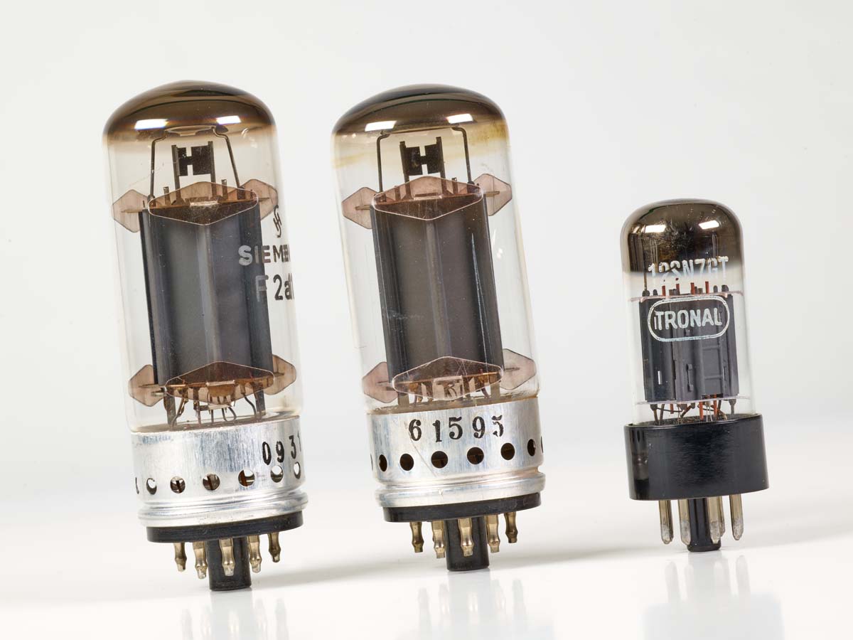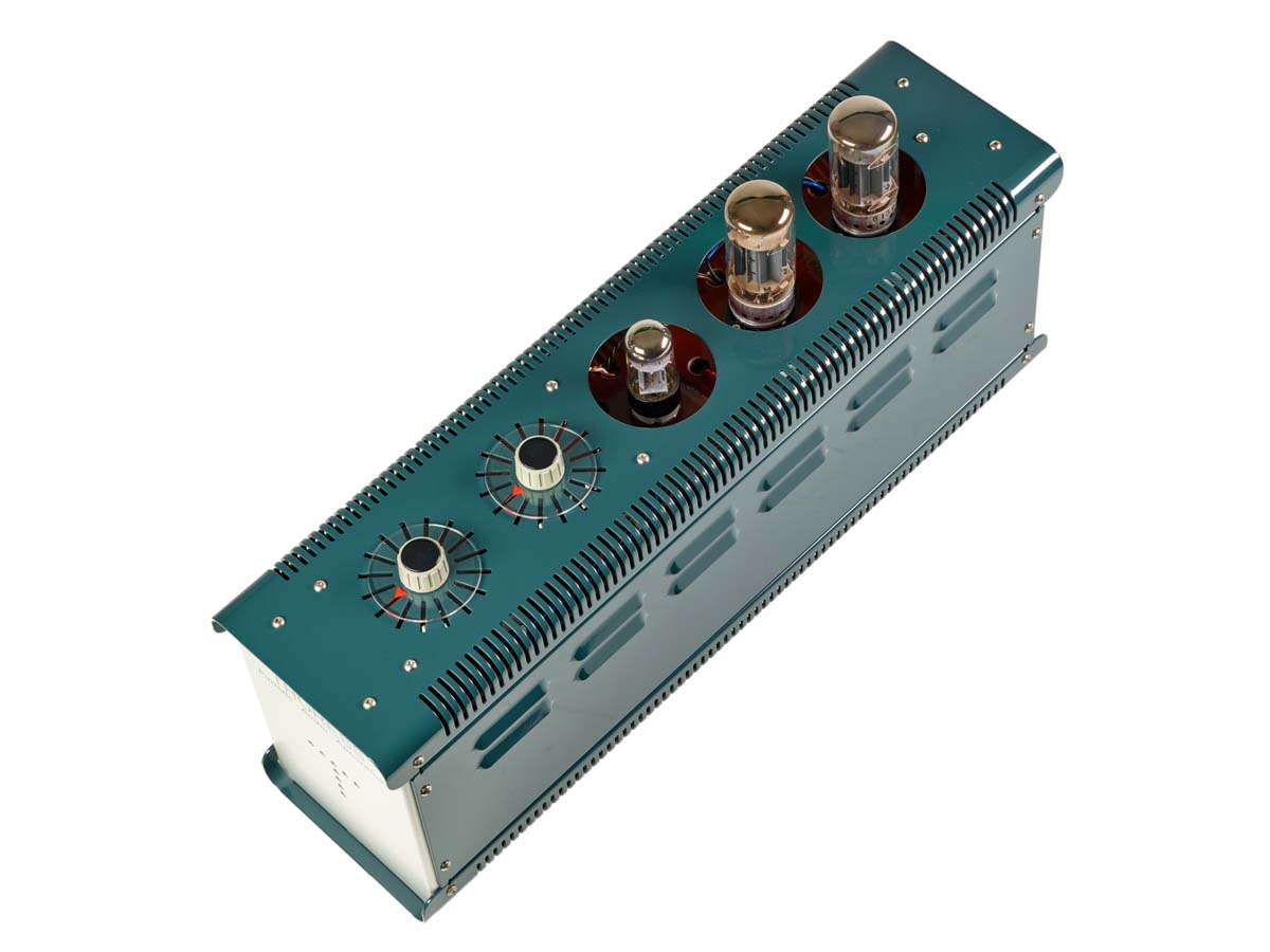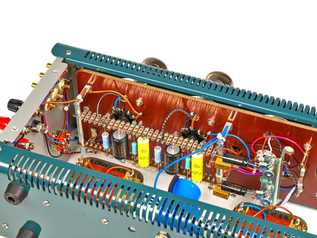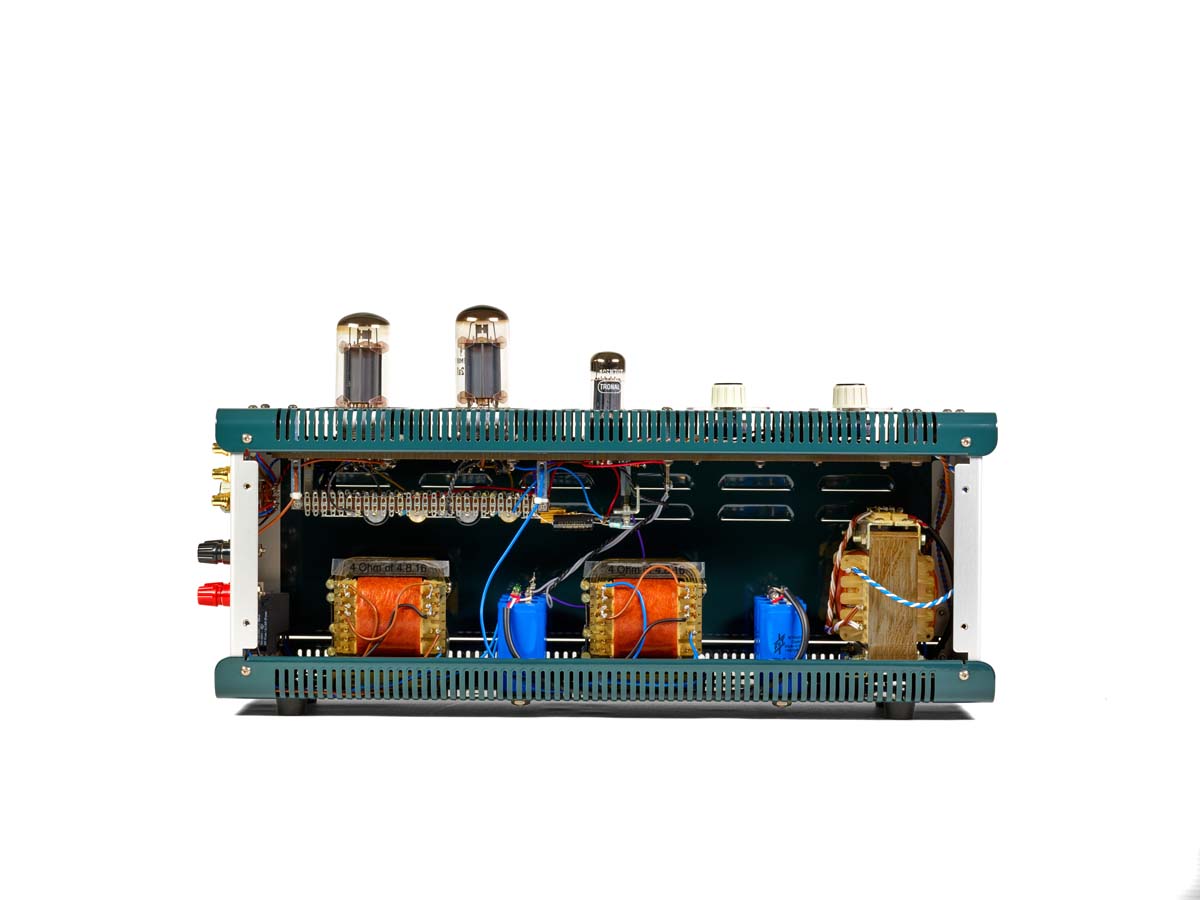 Die F2A11-Endstufenröhren werden in Triodenschaltung betrieben und liefern eine Ausgangsleistung von 6 Watt pro Kanal. In der Stromversorgung sitzen hochwertige Gleichrichterdioden und Elektrolytkondensatoren. Die Ausgangstransformatoren verfügen über bandgewickelte Schnittkerne und ermöglichen die präzise Anpassung einer Last von 4, 8 oder 16 Ohm an die Leistungsröhre über an die Sekundärklemmen gelötete Jumper. Der Netztrafo, obwohl vibrationsarm und streufeldarm konzipiert, ist vom Gehäuse mit Schwingungsdämpfern mechanisch entkoppelt. Die Schaltung ist bis auf das Äußerste reduziert und arbeitet ohne Gegenkopplung. Warum aber Siemens-NOS-Tetroden vom Typ F2A11, die einst die legendären Klangfilm-Kinoverstärker befeuerten? Ihr niedriger Innenwiderstand ist vergleichbar mit dem von 300B-Röhren. Dieser Parameter wirkt sich drastisch auf die Übertragungsverzerrung und den Frequenzgang der Endröhrenstufe aus. Vor allem aber sind die Antriebsanforderungen der F2A11 im Vergleich zu einer 300B-Röhre um den Faktor vier niedriger. Das Ergebnis ist eine viermal geringere Treiberverzerrung bei gleicher Leistung als bei der weit verbreiteten 300B.