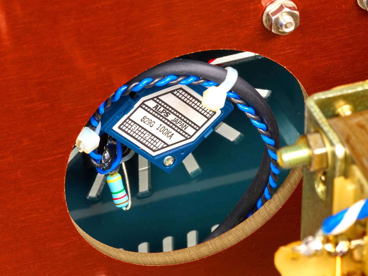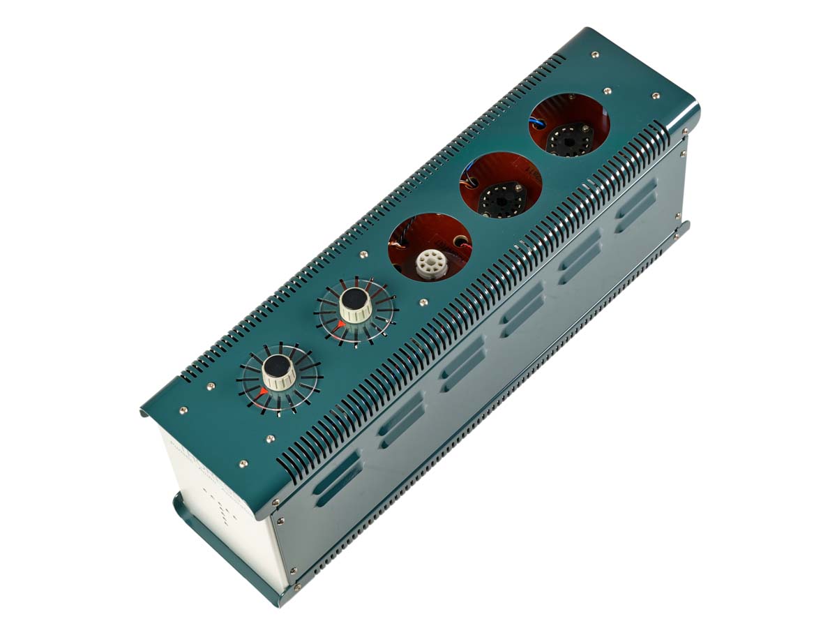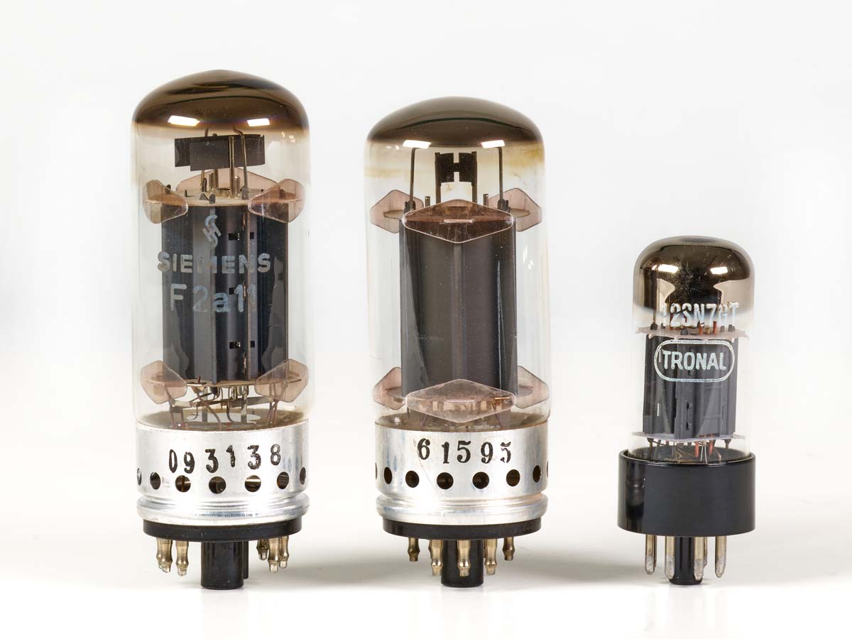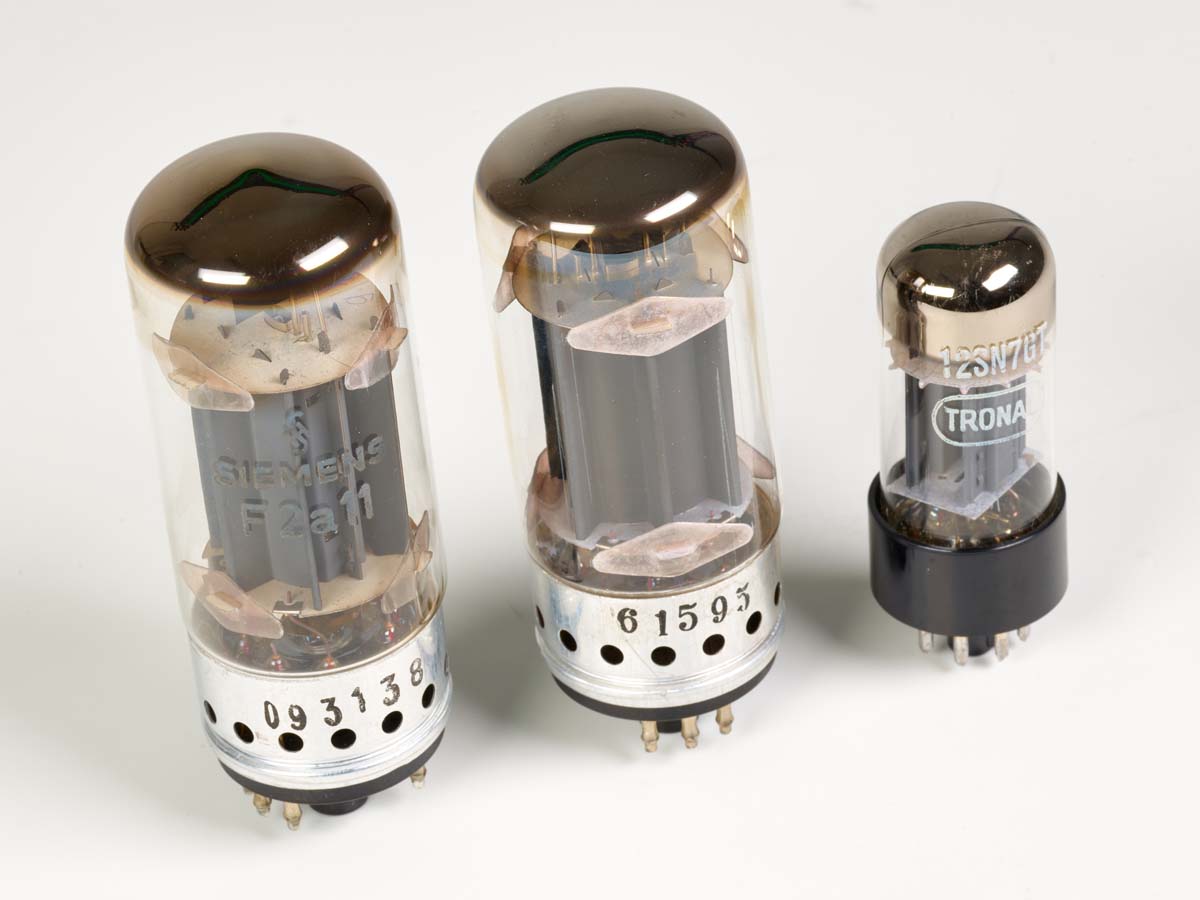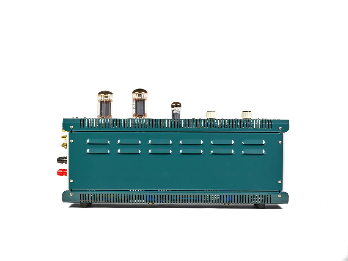 Die F2A11-Endstufenröhren werden in Triodenschaltung betrieben und liefern eine Ausgangsleistung von 6 Watt pro Kanal. In der Stromversorgung sitzen hochwertige Gleichrichterdioden und Elektrolytkondensatoren. Die Ausgangstransformatoren verfügen über bandgewickelte Schnittkerne und ermöglichen die präzise Anpassung einer Last von 4, 8 oder 16 Ohm an die Leistungsröhre über an die Sekundärklemmen gelötete Jumper. Der Netztrafo, obwohl vibrationsarm und streufeldarm konzipiert, ist vom Gehäuse mit Schwingungsdämpfern mechanisch entkoppelt. Die Schaltung ist bis auf das Äußerste reduziert und arbeitet ohne Gegenkopplung. Warum aber Siemens-NOS-Tetroden vom Typ F2A11, die einst die legendären Klangfilm-Kinoverstärker befeuerten? Ihr niedriger Innenwiderstand ist vergleichbar mit dem von 300B-Röhren. Dieser Parameter wirkt sich drastisch auf die Übertragungsverzerrung und den Frequenzgang der Endröhrenstufe aus. Vor allem aber sind die Antriebsanforderungen der F2A11 im Vergleich zu einer 300B-Röhre um den Faktor vier niedriger. Das Ergebnis ist eine viermal geringere Treiberverzerrung bei gleicher Leistung als bei der weit verbreiteten 300B.