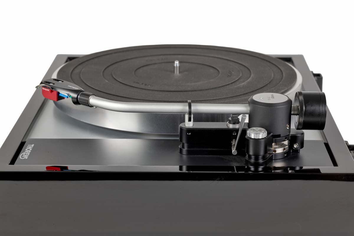 Dass Firmeninhaber Gunter Kürten die Funktionsweise eines Gerätes zur Schallplattenwidergabe im Griff hat, konnten schon die kleineren Modelle beweisen. Bisher war jeder Thorens, der hier zu Gast war, ein Garant für äußerst vergnügliche Stunden beim Vinylsurfen. Wie schon beim TD 1500 ist auch die Verarbeitung des größeren Bruders absolut makellos. Lackqualität, Spaltmaße, Haptik – alles auf höchstem Niveau. Die Zarge wahlweise in Walnuss oder schwarzem Hochglanzlack, das obere Board passend zum Teller in mattem Alu, das Tonarm-Board dann wieder in Schwarz matt abgesetzt. Sehr schick und voll im Retrotrend.