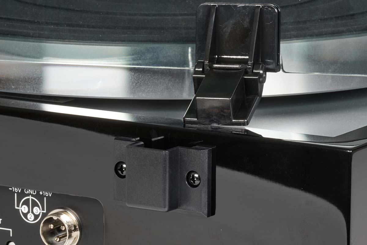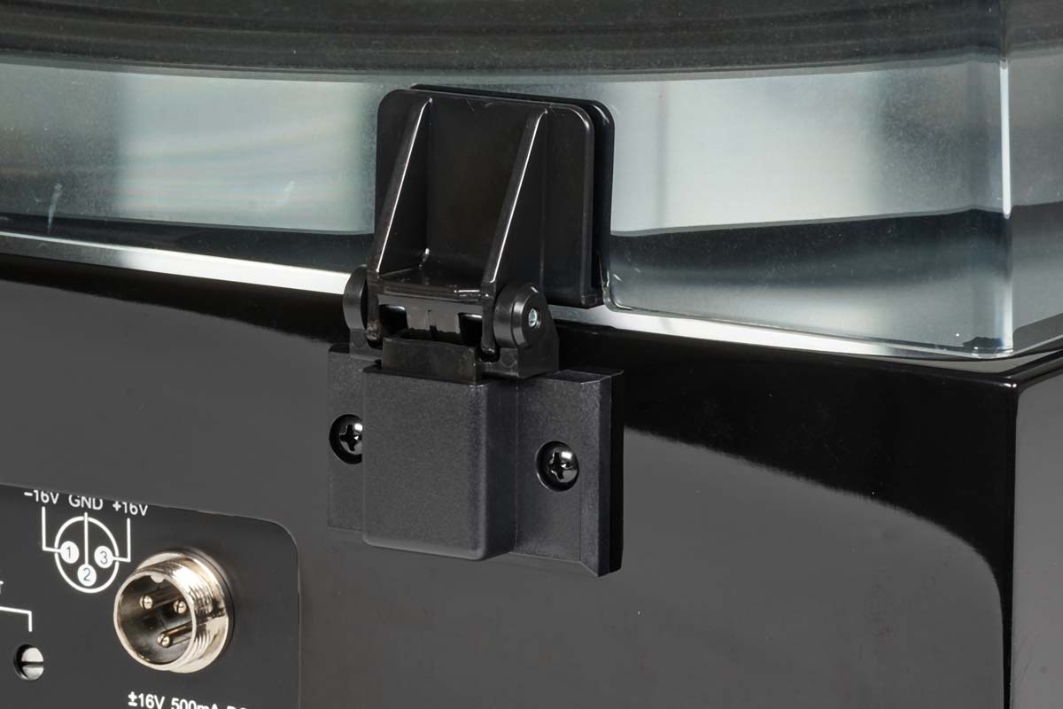 Doch nicht nur in den Teller wurde Hirnschmalz investiert, auch um Kleinigkeiten wurde sich gekümmert. So wanderte der recht kräftige Motor nach vorne links, quasi in die Verlängerung der Achse Tellerlager und Tonarm. Ein dünner, mittels Schaumstoff bedämpfter Stahlfaden zwischen Tellerlager und Tonarmbasis egalisiert die auftretenden Zugkräfte des Motors und entlastet damit das Lager. Nicht gerade alltäglich, doch hochfunktional.