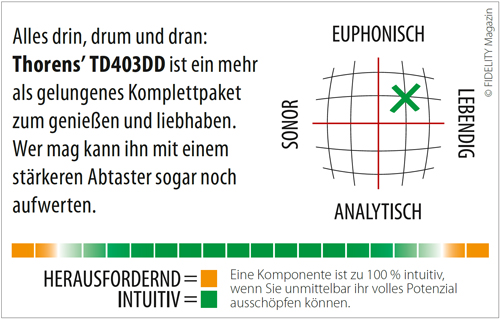 Mit dem TD 403 DD ist Thorens-Mastermind Gunter Kürten und seinen Entwicklern erneut ein Paket gelungen, das auch im Direktvergleich mit deutlich teureren Plattenspielern auf Augenhöhe spielt. Dank wartungsfreiem Antrieb, makellosem Finish und zeitlosem Design kann man da, sollte man ernsthaft am Thema Vinyl interessiert sein, fast nicht anlegen.