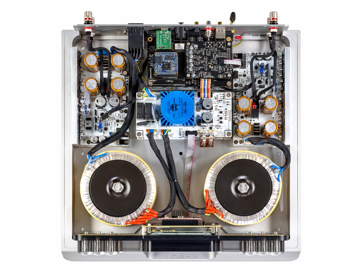 Der digitale Part ist modular aufgebaut. Zum hauseigenen R2R-DAC gesellen sich ein potenter Abtastratenwandler des Typs AK 4137 und ein herausragendes Streamingmodul des koreanischen Spezialisten „mconnect“. Der DAC nutzt vier IC-Widerstandsnetzwerke mit 16 Bit und erreicht damit eine maximale Auflösung von 24 Bit sowie eine Samplerate von 384 Kilohertz. Der Nutzer hat die Möglichkeit, zwischen drei Digitalfiltern zu wählen (Sharp, Slow, Bypass), die sich über das große Display an der Front unkompliziert umschalten lassen. Eine Smartphone-App gibt es nicht. Das User Interface des Thrax mit seinen geradezu asketisch klar strukturierten Menüs demonstriert, unterstützt durch eine Apple-Fernbedienung, dass es immer noch gut ohne geht. Übrigens: Obwohl die Hardware im Ares Roon und MQA unterstützt, hatte der Hersteller zum Testzeitpunkt beides noch nicht lizenziert. Mit Roon sei man im Dialog, sagt Entwickler Rumen Artarski – wer also nicht per UPnP/DLNA streamen möchte, erfragt im Zweifelsfall den Stand der Roon-Dinge beim HiFi-Händler oder beim deutschen Vertrieb. Den nicht unumstrittenen MQA-Algorithmus hingegen halte man bei Thrax nach anfänglicher Begeisterung für entbehrlich und werde die Decodierung definitiv nicht aktivieren.