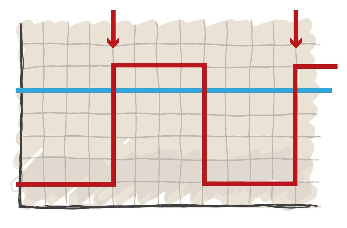 Jitter (engl. für „Zittern“) ist ein interessanter Fehler. Interessant deshalb, weil er uns vergegenwärtigt, wie analog integrierte Schaltungen funktionieren. Mathematiker wie Alan Turing erkannten in der ersten Hälfte des 20. Jahrhunderts, dass sich die Welt in Binärketten abbilden lässt. Physik, Geologie, Bilder, Musik, ja sogar der Wechsel Ihrer Gesichtsfarbe beim Luftanhalten – alles lässt sich in Nullen und Einsen ausdrücken, berechnen, in mathematischen Modellen vorhersagen und speichern. Artig hintereinander gereiht können Binärinformationen unvorstellbar hohe Zahlenwerte und schier endlose Zahlenketten repräsentieren. Da man zur Abbildung lediglich zwei Parameter benötigt, „ja und nein“, „an und aus“ oder eben „0 und 1“, lässt sich das erstaunlich einfach elektrifizieren: Man nehme einen steuerbaren Schalter, der die Stromzufuhr unterbricht (die binäre „0“) oder aktiviert (die binäre „1“). Heraus kommt eine Rechteckspannung, die sich wunderbar durch Kabel und Platinen leiten lässt.