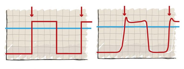 Im theoretischen Ideal sind die Flanken eines Digitalsignals unendlich steil, eine sprichwörtliche Mauer. Der Übergang von einer „0“ zur „1“ erfolgt abrupt. In der Praxis klappt das leider nicht ganz. Da Verzerrungen die Flanken abflachen, wird der exakte Punkt, an dem ein Wert in den anderen übergeht, zur Interpretationssache. An sich ist das noch kein Problem, denn schließlich diktiert der Taktgeber den DAC- und DSP-Chips einer HiFi-Komponente, wann die Übergänge stattzufinden haben. Doch dummerweise übermittelt die Clock ihre Timing-Information ebenfalls mit ultrakurzen Rechtecken, sogenannten Nadelimpulsen – und auch die werden verzerrt. Aus dem exakt definierten Zeitpunkt, an dem der folgende Takt den vorherigen ablöst, wird ein vergleichsweise undefinierter Zeitraum, Fakten werden zu Möglichkeiten.