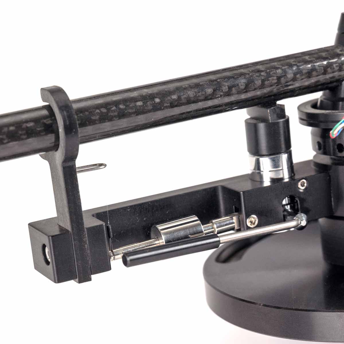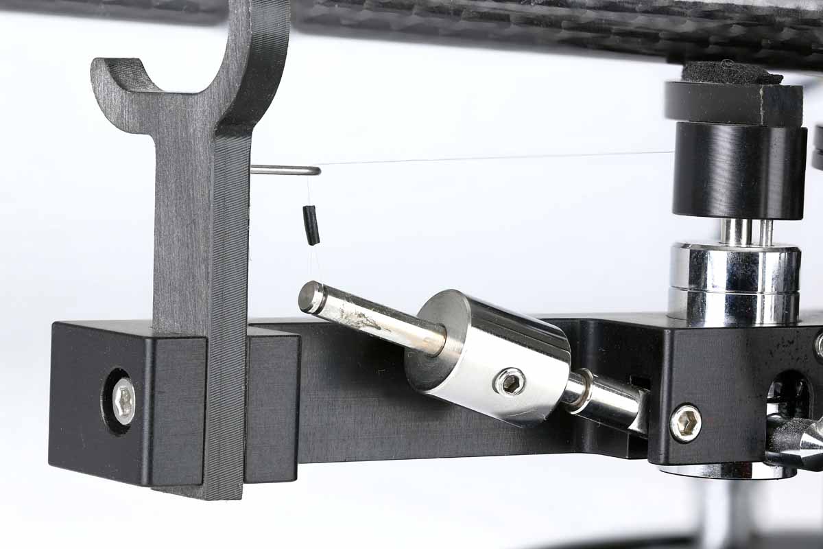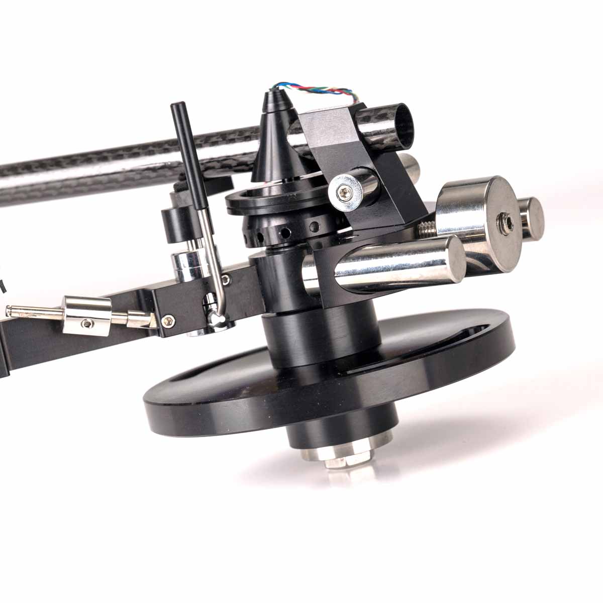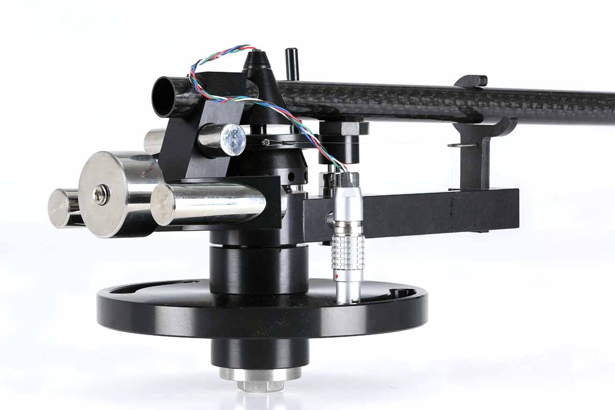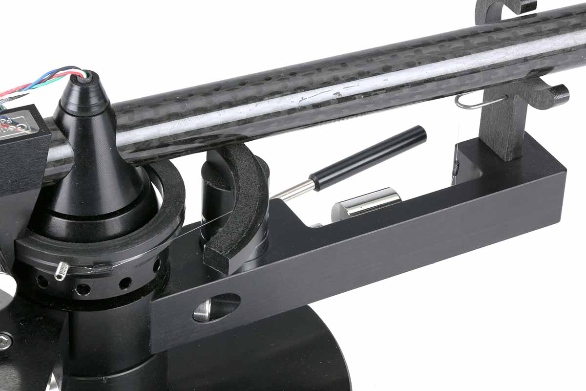 Die Geschichte dieses geraden Zehnzöllers aus Carbon geht weit zurück. Schon Ende der Siebziger verwirklichte Designer Helmut Thiele – damals noch Student – charakteristische Ideen in einem Prototypen aus Aluminium. Die Konzentration der Gegengewichte, auch lateral, um den Drehpunkt und der umgelenkt auf einen Hebel wirkende Antiskatingmechanismus waren damals schon prinzipiell identisch. Der Antiskatingfaden verläuft in einer Nut in Höhe des Drehpunkts und wird über einen Umlenkhaken in den Hebel am Armlift eingehängt. Simpel, aber effektiv, denn es hilft, den Arm zu stabilisieren. Ganz ähnlich funktionieren auch die Gegengewichte: Über die seitlichen Torpedo-Ausleger, allfällige Enterprise-Vergleiche erspare ich Ihnen, wird die Auflagekraft voreingestellt, die Feineinstellung erfolgt schließlich anhand des runden Schraubgewichts. Jene drei Gewichte haben ihren Schwerpunkt unter dem Lager, der quer liegende Bolzen zur Azimutjustage befindet sich dagegen aus guten Gründen mit dem Antiskatingfaden und dem Tonabnehmer auf der anderen Seite der Wippe genau auf Höhe des Drehpunkts. Dass diese Maßnahmen Wirkung zeigen, spürt man als Benutzer unmittelbar, sobald man den Arm an der Headshell führt: Er kippt kaum und lässt sich problemlos auch ohne Lift in die Einlaufrille senken.