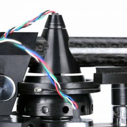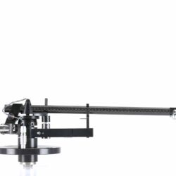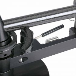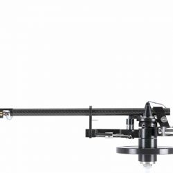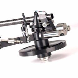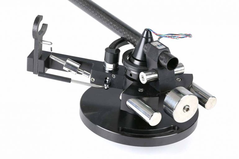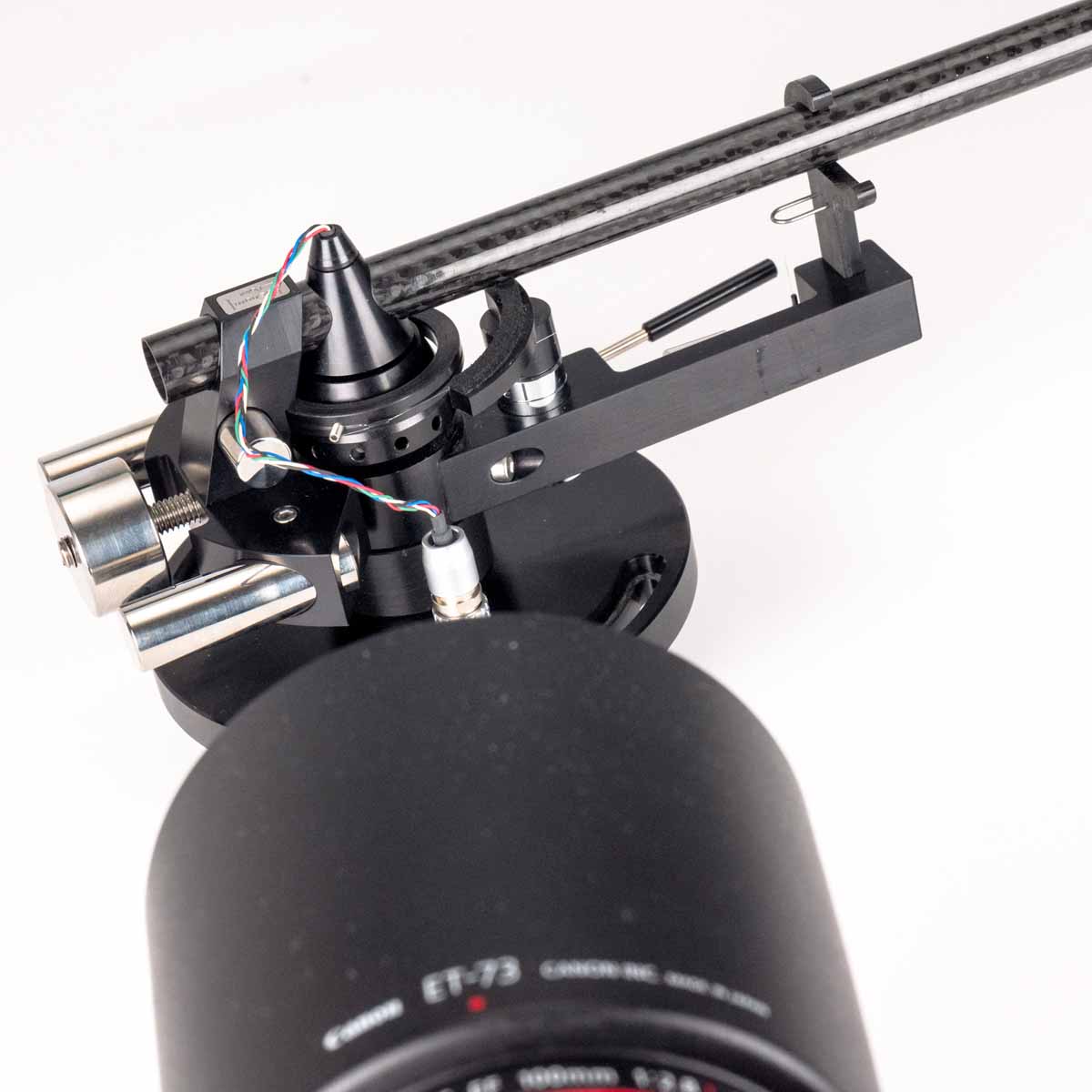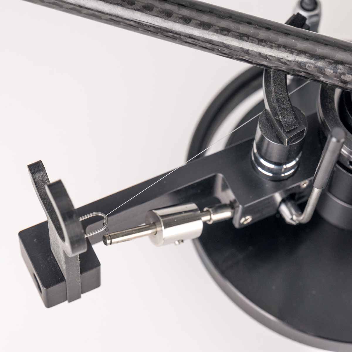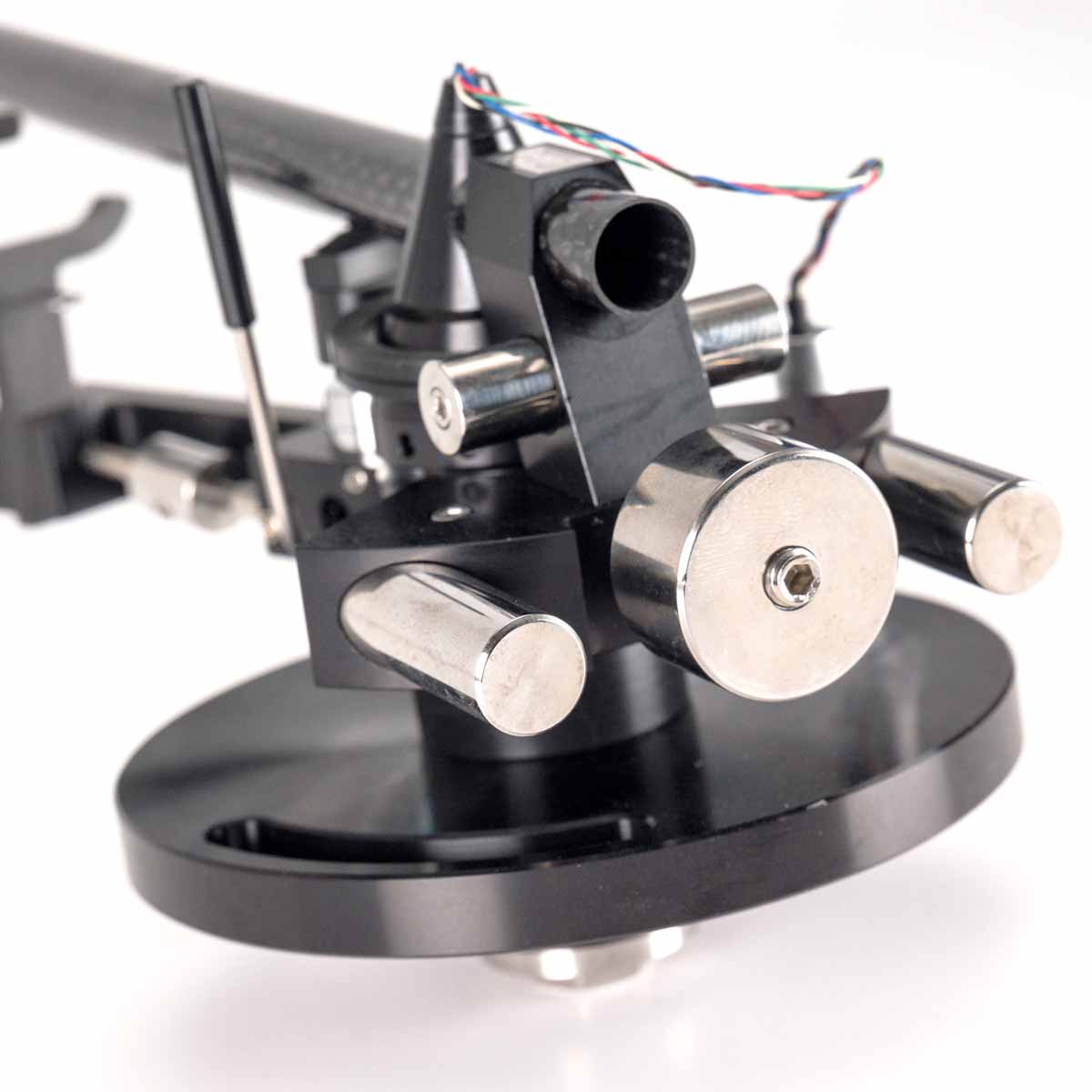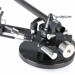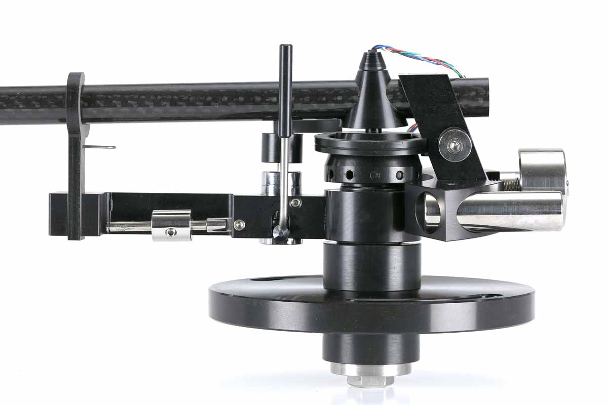 Die Geschichte dieses geraden Zehnzöllers aus Carbon geht weit zurück. Schon Ende der Siebziger verwirklichte Designer Helmut Thiele – damals noch Student – charakteristische Ideen in einem Prototypen aus Aluminium. Die Konzentration der Gegengewichte, auch lateral, um den Drehpunkt und der umgelenkt auf einen Hebel wirkende Antiskatingmechanismus waren damals schon prinzipiell identisch. Der Antiskatingfaden verläuft in einer Nut in Höhe des Drehpunkts und wird über einen Umlenkhaken in den Hebel am Armlift eingehängt. Simpel, aber effektiv, denn es hilft, den Arm zu stabilisieren. Ganz ähnlich funktionieren auch die Gegengewichte: Über die seitlichen Torpedo-Ausleger, allfällige Enterprise-Vergleiche erspare ich Ihnen, wird die Auflagekraft voreingestellt, die Feineinstellung erfolgt schließlich anhand des runden Schraubgewichts. Jene drei Gewichte haben ihren Schwerpunkt unter dem Lager, der quer liegende Bolzen zur Azimutjustage befindet sich dagegen aus guten Gründen mit dem Antiskatingfaden und dem Tonabnehmer auf der anderen Seite der Wippe genau auf Höhe des Drehpunkts. Dass diese Maßnahmen Wirkung zeigen, spürt man als Benutzer unmittelbar, sobald man den Arm an der Headshell führt: Er kippt kaum und lässt sich problemlos auch ohne Lift in die Einlaufrille senken.