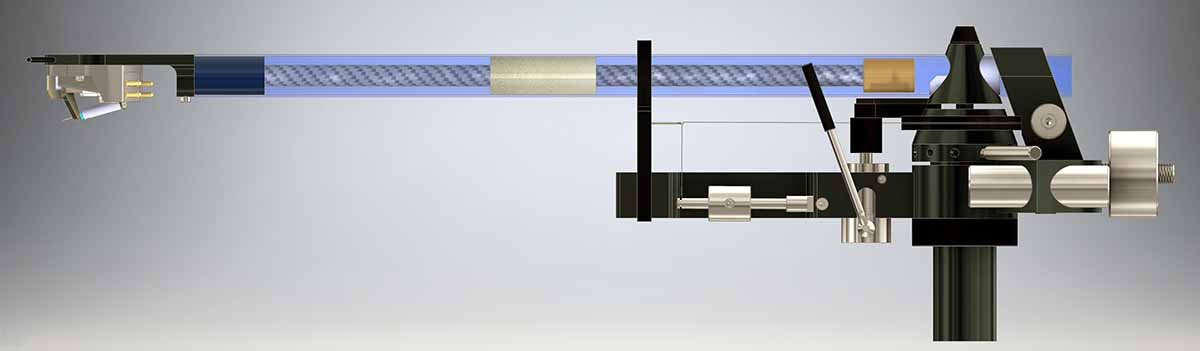 Wirklich speziell wird der Point erst da, wo neugierige Blicke ausgesperrt bleiben: im Armrohr. Die äußere Hülle besteht aus dem Trendmaterial Carbon, das bekanntermaßen spitzenmäßige Dämpfungseigenschaften bei gleichzeitiger Rigidität aufweist. Spannender ist der Längsschnitt durch dieses Rohr. Er offenbart ein zweites, innen liegendes Carbonrohr, das vorne mittels eines O-Rings Kontakt zum äußeren aufnimmt, hinten jedoch, nahe des Drehpunkts, in einem scheinbar frei schwingenden Gewicht endet. Scheinbar, weil es in der Mitte des Armes, dort, wo auch Resonanzen am stärksten sind, von sogenanntem Visco-Schaum, den man von hochwertigen Matratzen kennt, umschlossen wird. Dieser viscoelastische Schaumstoff, der sich sehr sensibel deformiert, aber nur träge in seine Ausgangsform zurückkehrt, hält ebenfalls Kontakt zum äußeren Armrohr, dämpft also sowohl den Kern als auch die Hülle. Auch hier wird wieder die Idee ersichtlich, die effektive Masse um den Lagerpunkt zu konzentrieren, denn jenes innere Gewicht verschiebt natürlich den Schwerpunkt des Armrohres in dessen Richtung. Der tiefere Sinn dahinter: Resonanzen sollen vorne, wo sie beim Abtastvorgang entstehen, vom inneren Tonarmrohr aufgenommen und nach hinten in das Resonanzgewicht abgeleitet werden. Der Schaumstoff auf halbem Weg trägt ebenfalls seinen Teil zur Energievernichtung bei – auch in der Gegenrichtung, denn trotz seiner Trägheit pendelt das Gewicht notgedrungen geringfügig. Da sich die effektive Masse aus der kinetischen Energie eines Festkörpers ergibt, die wiederum abhängig von der einwirkenden Kraft in Form von Geschwindigkeit ist – so weit mein laienhaftes Verständnis –, ist die bewegte Masse des Point laut Helmut Thiele nicht exakt zu bestimmen. Er spricht von einem mittelschweren bis schweren Arm, was sich genau mit meinen Höreindrücken deckt. Inspiration für diese sehr ungewöhnliche Konstruktion fand er übrigens in Schwingstäben, wie sie in der Gymnastik verwendet werden.