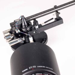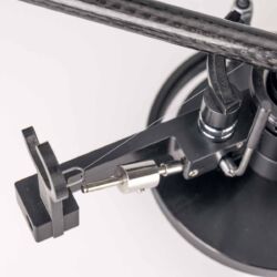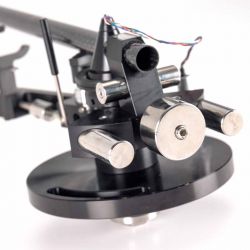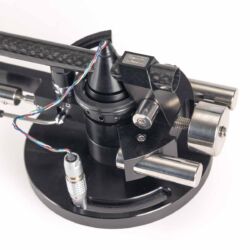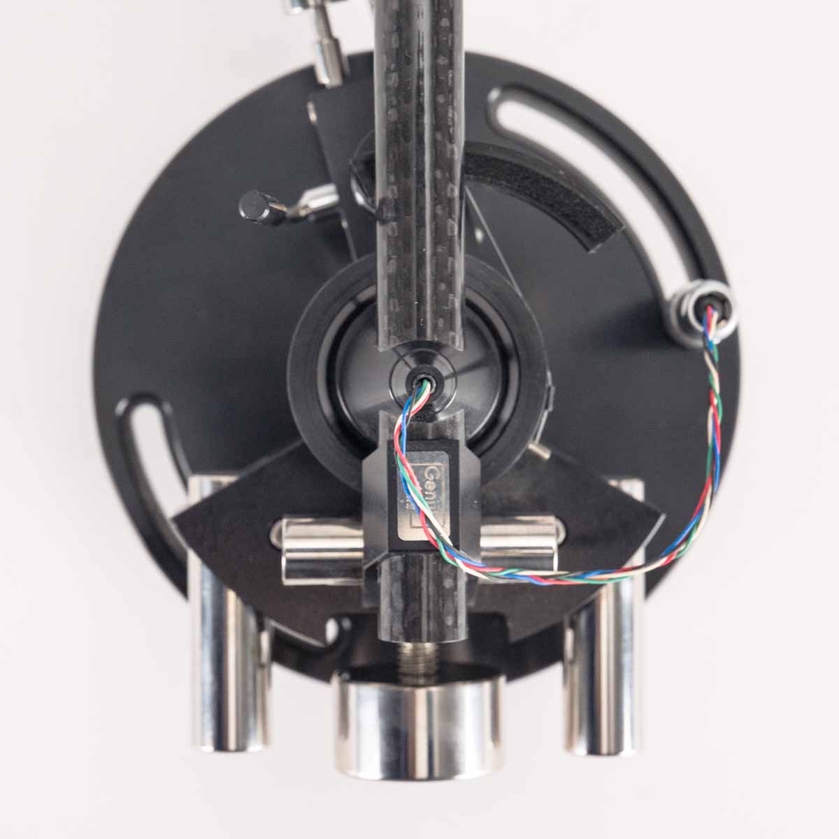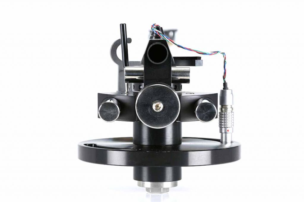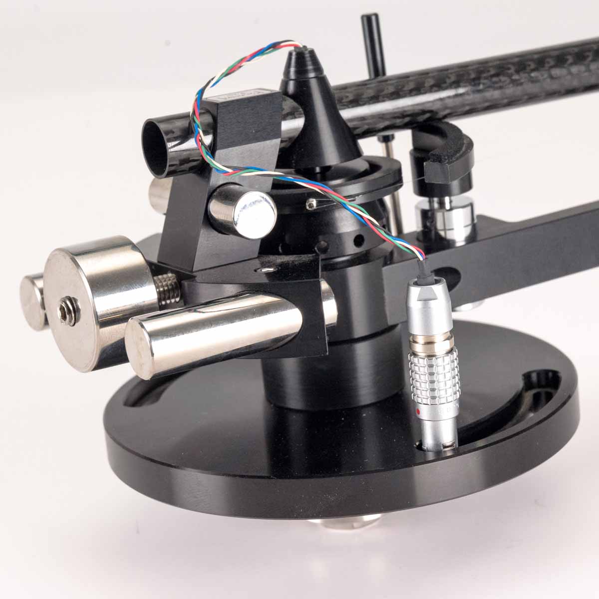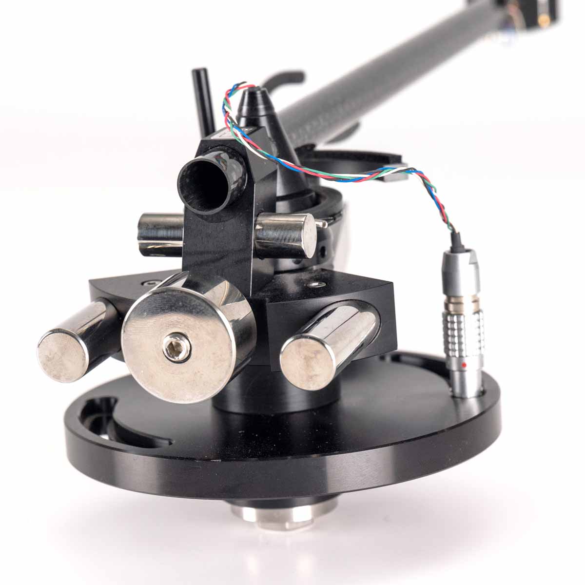 Unter der Führung des Antiskatingfadens befindet sich ein Lochkreis, der über ein Gewinde der VTA-Justage dient, es liegt sogar ein passender kleiner Schraubbolzen bei. Dieser Mechanismus ist direkt mit der außergewöhnlich massiven und resonanzarmen Basis verbunden. Da die Signalkabel nach oben geführt sind, lässt sich der gesamte Aufbau abnehmen, dabei immer vorsichtig den im Verhältnis zu den dünnen Litzen schweren Lemo-Stecker entlasten, und – so schlägt es der Vertrieb vor – gegen ein zweites (oder gar drittes oder viertes) Armrohr mit bereits justiertem alternativen Tonabnehmer austauschen. Das ist nicht nur eine gute Geschäftsidee, sondern wäre auch wirklich praktisch gewesen. Leider stand mir nur ein Set zur Verfügung, weshalb ich die Systeme auf herkömmliche Art wechseln musste. Aber auch das geht bekanntlich einfacher von der Hand, wenn man Headshell oder eben gleich das ganze Armrohr unter die Schreibtischlampe halten kann, statt mit schräggelegtem Kopf irgendwie immer im eigenen Schatten von oben zu schrauben und – je nach Tonabnehmer – von unten zu fummeln.