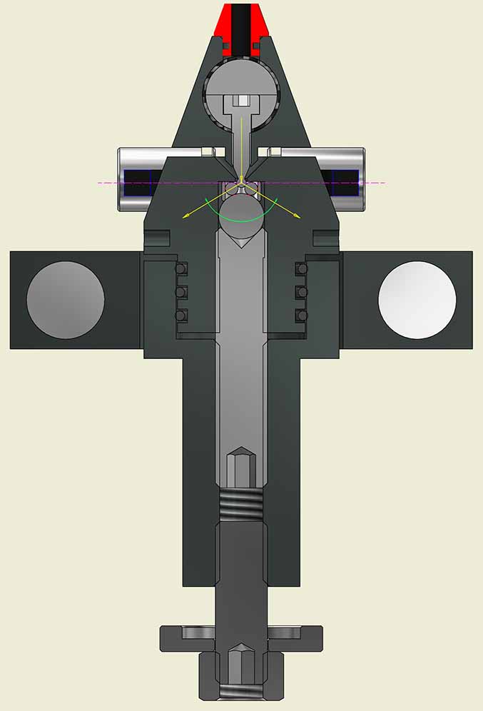Seine relative Unerschütterlichkeit bezieht der Point aber nicht nur aus der cleveren Gewichtsverteilung, sondern verdankt sie auch seinem Lager. Man müsste es eigentlich als Dreipunktlager bzw. stabilisiertes Einpunktlager bezeichnen. Linst man in das Oberteil des Arms, das sich einfach abheben lässt, erblickt man eine Kugel, die offenbar auf einen Stift oder eine Schraube geschweißt ist. Sie findet ihren Platz in einer Lagerschale aus drei Kugeln, die wiederum auf einer größeren im Schaft des Arms liegen. Der Drehpunkt des Arms befindet sich genau im Mittelpunkt der von oben kommenden Kugel, die allerdings an drei Punkten Kontakt zur Basis aufnimmt. Die Besonderheit dieser gefetteten Konstruktion liegt in der unterschiedlichen Reaktion auf die Drehrichtung: Horizontal läuft der Point wunderbar frei und ohne Widerstand, da die drei Kugeln der Lagerpfanne mitrollen, vertikal dagegen werden sie von dazwischenliegenden Kunststoffelementen gehalten, wodurch Reibungswiderstand entsteht, der die Bewegung des Armrohres hemmt und die gefürchtete Taumelbewegung eines Einpunkters schon in der Entstehung unterbindet.